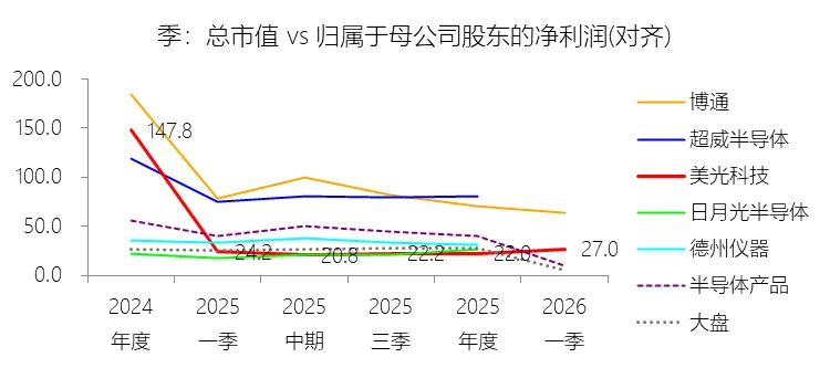 市盈率:2026财年Q1 TTM,美光科技的归属于母公司股东的净利润(对齐)为119.09亿美元,对比年初增长39.47%,总市值与归属于母公司股东的净利润(对齐)的比例为27.0倍(市盈率),对比年初上升4.98个倍数;2015-2024财年(十年),此项合计为403.40亿美元,平均比例为15.2倍,比半导体产品行业的均值低14.78个倍数,长期呈上升趋势。