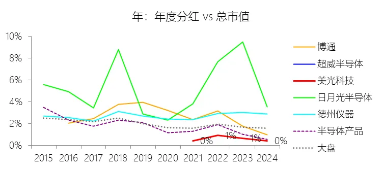 股息率:2024财年,美光科技的股息率为0.45%,同比下降0.23个百分点;2015-2024财年(十年),平均股息率为0.32%,比半导体产品行业的均值低0.95个百分点,长期呈下降趋势。