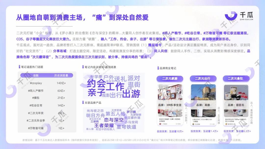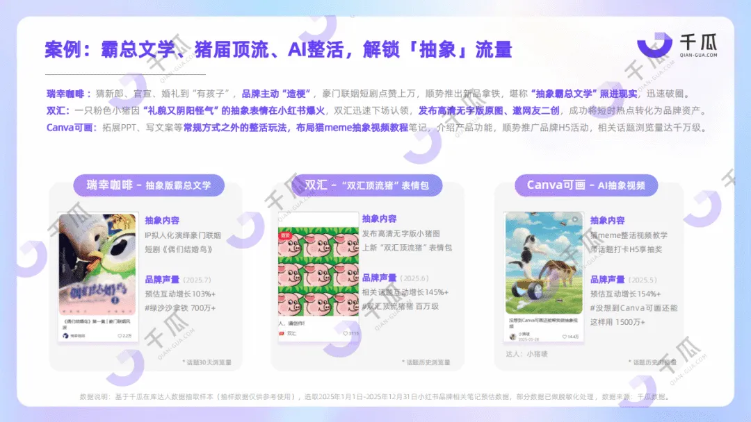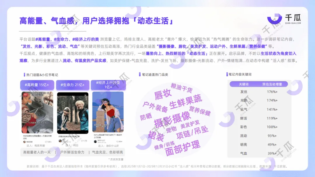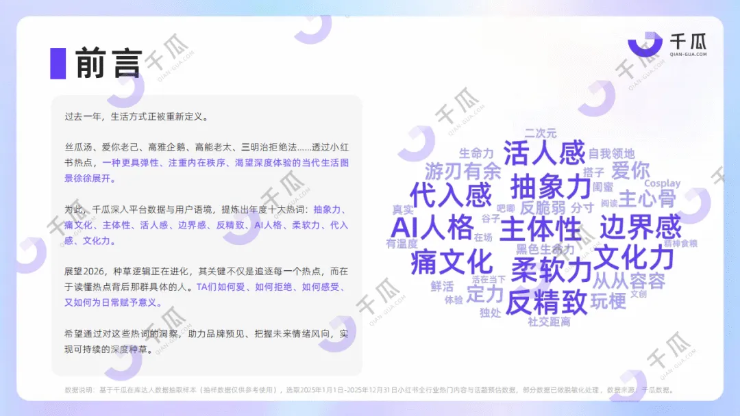 千瓜2026年小红书平台十大热词洞察数据报告,基于2025年全年平台数据,提炼出抽象力、痛文化、主体性、活人感、边界感、反精致、AI人格、柔软力、代入感、文化力十大热词,勾勒出当代人注重内在秩序、追求深度体验的生活图景,也揭示了小红书种草逻辑的进化趋势,为品牌营销提供方向。