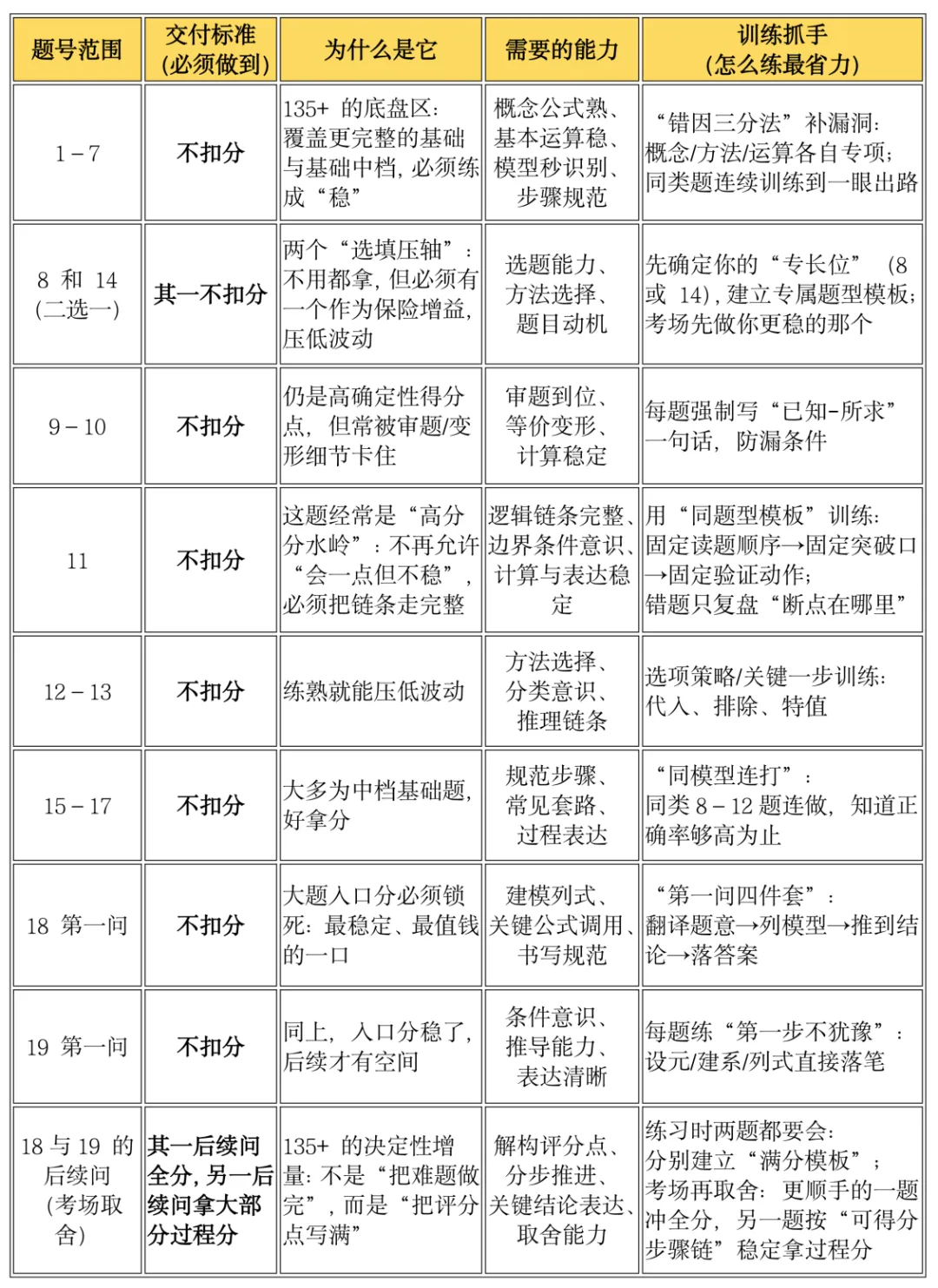 对应:8/14 的“专长位”、18/19 后续问(至少一题全分)验收标准:能切入、能推进、能在卡点处换路并保分;不是“做出来一次”,而是能稳定复现。