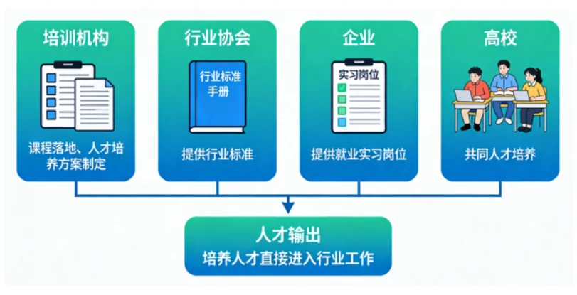 这种模式下,教育培训机构作为“执行主体”,负责教学实施、课程落地;行业协会作为“指导主体”,负责标准制定、资源对接;企业作为“实践主体”,负责提供实训场景、岗位资源,三者协同发力,实现“教育教学与行业需求对接、实训实践与岗位技能对接”,真正实现产教融合,最终解决学生就业难、企业用工难的问题,服务地方行业或全行业发展。