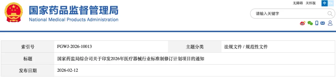 2月12日,国家药监局发布《国家药监局综合司关于印发2026年医疗器械行业标准制修订计划项目的通知》,面向北京、天津、辽宁、上海、江苏等重点省市药监局,中检院(器械标管中心)、器审中心、北京大学口腔医学院口腔医疗器械检验中心等单位作出工作部署。