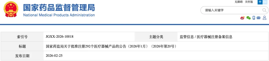 国家药监局发布:《国家药监局关于批准注册292个医疗器械产品的公告(2026年1月)(2026年第20号)》