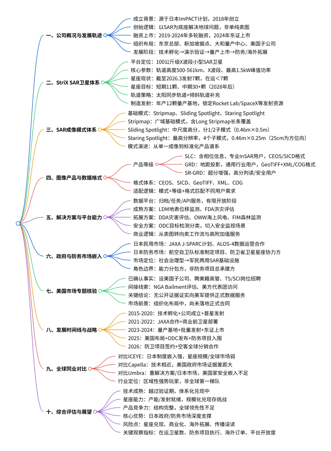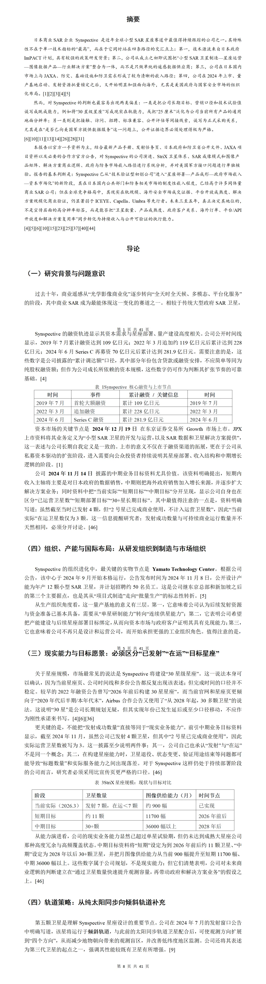 本报告《Synspective公司分析报告:日本商业SAR星座、图像产品体系、解决方案能力与军政市场嵌入路径研究》约3.1万字,以官方一手资料与最新版产品/格式手册为基线,系统梳理Synspective的技术源流(ImPACT)、公司演进与量产能力(Yamato量产中心)、StriX星座部署现实(截至2026年3月10日公开可确认7颗成功发射,强调“发射数≠在运数”)、SAR成像模式谱系(Stripmap/Sliding/Staring Spotlight等)与数据产品矩阵(SLC/GRD/SR-GRD及CEOS/SICD/GeoTIFF等格式),并进一步拆解其平台/API与行业解决方案(形变、洪灾、目标检测等)的成熟度边界;在市场与政府/防务嵌入方面,重点评估其在日本公共部门与防卫项目中的制度化嵌入,同时对“美国军方接口/供数”相关说法进行单独核验,明确公开证据可支持到“布局与评估线索”,但不足以证明“已获美军正式数据服务合同”,最后给出同业比较与未来3—5年可跟踪指标。