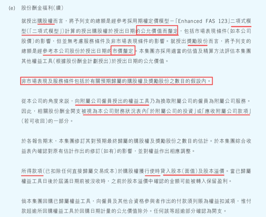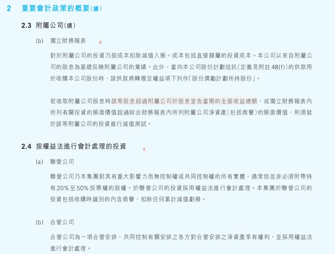 与A股所有者权益变动表一样,反映了公司所有者权益的变化情况,附注中披露的内容不多,读者可以参考上图中,笔者红色标注部分来辅助理解。购买无形资产的付款/预付款项,放在投资活动现金流量下,笔者理解应该指的是媒体内容、游戏内容等与内容资产购买相关的支出(购买音乐、影视、游戏等属于公司投资行为,该资产购买后能够给公司未来带来经营现金流入,如财报中披露的「增值服务-社交网络服务收入」)。购买/处置以公允价值计量且其变动计入其他全面收益的金融资产,主要指的是针对上市公司少数股权的投资行为。购买/处置以公允价值计量且其变动计入损益的金融资产,主要指的是针对非上市公司少数股权的投资行为。从上面 投资活动现金流量 披露的数据可知,腾讯2024年在股权投资上的交易额接近千亿的规模(是不是有种“散户炒股”的感觉,不过腾讯的投资团队绝对是世界一流的水平)。现金流量表财报附注披露较少,涉及的科目相对好理解,此处不赘述。上表以利润为基础,从另一个角度披露了企业经营活动现金流量变化的来龙去脉。按权益结算的股份酬金开支,笔者认为应该是指购股权计划中于2024年非现金支出所分摊的那部分开支(腾讯的股份酬金开支包括 按权益结算的股份酬金支出、按现金结算的股份酬金支出、股份奖励支出三部分组成)。重点披露了腾讯控股公司「财报中简称:本公司」是一家注册于开曼群岛的、于2004年在香港上市的外商投资控股公司。一家注册于开曼群岛的外资企业,属于一家纯投资控股公司,在国内并没直接持股的运营实体。腾讯控股与国内实际参与业务活动的业务实体,如腾讯计算机、世纪凯旋、深圳腾讯天游等实体之间,主要是通过VIE合约架构(协议控制)来实现对附属公司的控制与利润转移的,与股权控制并不是一个概念。腾讯财务报告的表述中,将协议控制的国内实体统称之为附属公司,即指腾讯控股拥有控制权的那部分实体,与大陆上市公司所表述的子公司相似。之所以表述上有差别,是因为腾讯控股并没有实际持有被控制公司的任何相关股权,各方之间只是一种合约控制关系,从法律意义上来看,并不是严格意义上的母公司与子公司的关系。为了准确反映腾讯控股与各业务实体之间的关系,才使用了“附属公司”这种表述方式。凡是财报中提到的附属公司,都是指腾讯控股100%控制或具有控制权的那部分实体,这部分受控实体以并表的方式记录在综合财务报表中。腾讯除了通过VIE协议控制的一部分实体外,还参股投资了很多非控制型企业,在财报中通常表述为联营、合营公司,以及拥有部分少数股权的交易性金融资产和可供出售金融资产。1个人理解,本集团收购的附属公司采用购买法(成本法)入账,并于综合报表进行业务合并。收购的成本包括已转让的资产、收购时发生的负债、已发行权益的公允价值之和。如果所付出的成本中有“或有代价安排产生的任何资产或负债”项,就以公允价值确认为「其他金融资产」或「其他金融负债」。以上的“或有代价”,可能是指被收购公司对外的一些承诺、担保或诉讼等未来可能发生也可能不发生(或发生的具体金额不确定)的资产/负债项。2个人理解,在合并报表中,对于非控制性权益(少数股东权益)的确认,按单项收购基准逐项确认。合并计算时,按比例计算分占的净资产权益,如,以公允价值/可辨认净资产的比例计量。3中的“除为发行权益而发生的成本外”,其他成本均作为期间费用处理。个人的理解,公司只对被收购公司新发行权益部分所支付的代价归入收购成本(长期股权投资),其他收购代价统统归入当期费用(如交易费、承销费用等)。4个人理解,分阶段对外收购的附属公司,每次收购都要按照最新收购的公允价值重新评估附属公司的投资成本(含历史已入账部分),重新评估后相对原账面价值而产生的盈亏,计入当期损益(投资收益/亏损)。5个人理解,收购部分的“或有代价”按照收购日公允价值进行确认,如果被归入资产/负债端,后续公允价值的变动确认为损益。如果被归入在权益端,后续公允价值的变动不予重新计算。6个人理解,若附属公司所有者权益发生改变,例如附属公司对外进行新的股权融资,虽然会导致公司股权被稀释但是不构成控制权丧失的情况下,公允价值与原收购部分账面价值的差额计入权益,并且视同处置部分的盈亏计入权益端,同时应该也会相应地调整损益端(即视同处置收益)。7个人理解,若失去对附属公司的控制权,那么已出售部分的收益或亏损归入损益表,同时将之前归入“其他全面收益”的对应部分重分类到损益端或其他权益端(视同出售)。剩下部分的权益,因股权变动而失去控制权,则按照公允价值确认,并根据持股比例重分类为联、合营公司或金融资产。8个人理解,附属公司按照成本法入账,做减值准备时扣减投资成本,并同步调整损益项,只有当附属公司宣布分红时,才会确认投资收益。股份计划信托所收购的本公司股份,归入权益项下的「股份奖励计划所持股份」科目。10联合营公司股份被摊薄,但不会引起资产重分类时的账务处理规则,与A股的账务处理规则一样(视同处置)。所有与资产相关的维修保养均于报告期内当作费用处理,笔者在附注中没有看到费用资本化处理的相关政策,公司财报政策还是比例偏保守的。处置