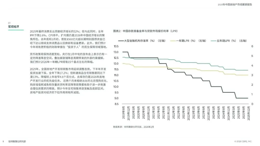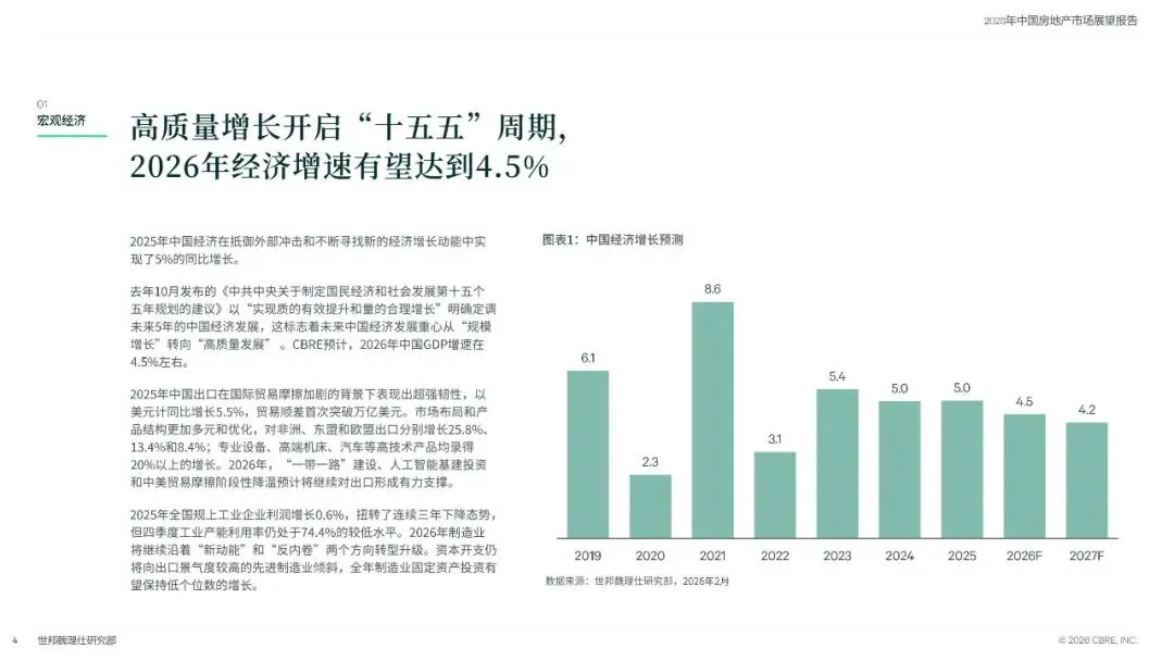 去年10月发布的《中共中央关于制定国民经济和社会发展第十五个五年规划的建议》以“实现质的有效提升和量的合理增长”明确定调未来5年的中国经济发展,这标志着未来中国经济发展重心从“规模增长”转向“高质量发展” 。CBRE 预计,2026 年中国GDP 增速在4.5% 左右。