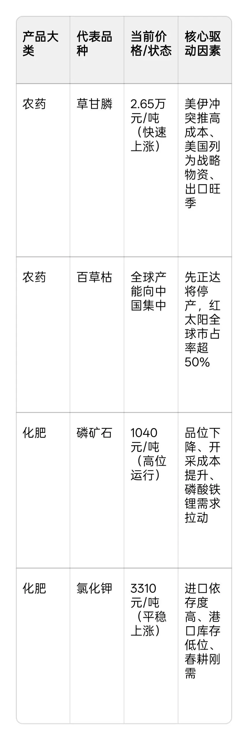 表:主要农化产品价格及市场动态(截至2026年3月)