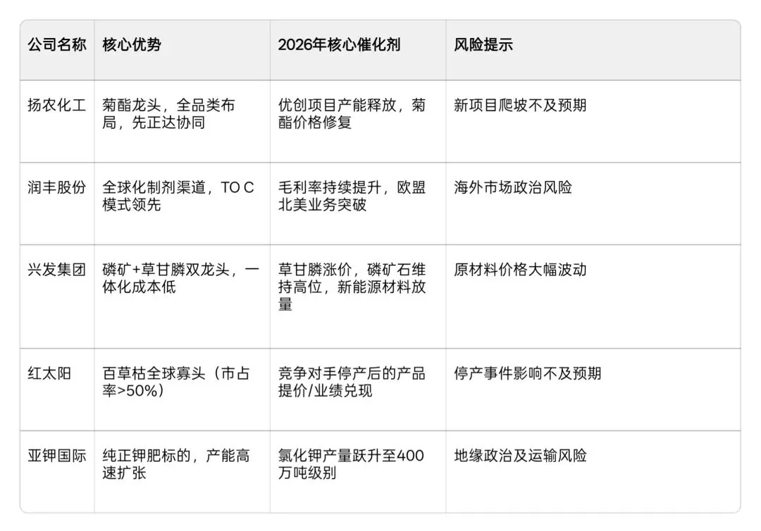 对于投资者而言,应优先选择具备资源壁垒(磷/钾)、技术壁垒(创制农药/中间体)或渠道壁垒(全球登记网络) 的行业龙头,分享行业集中度提升及周期上行的双重红利。