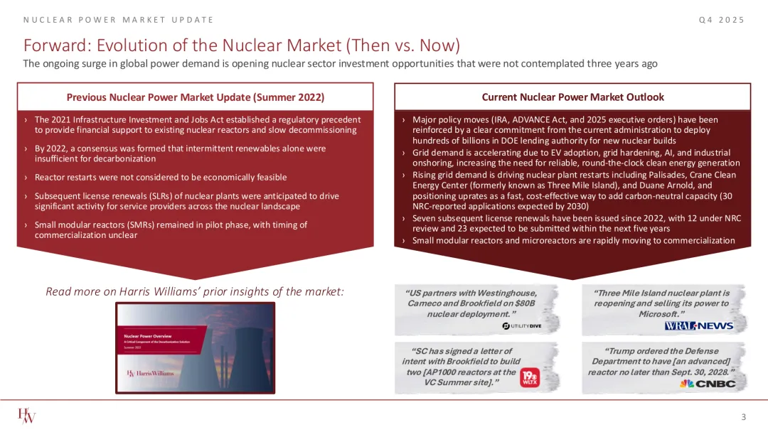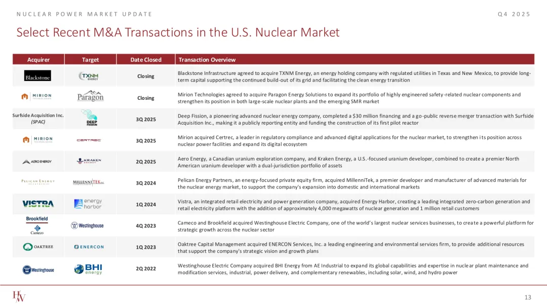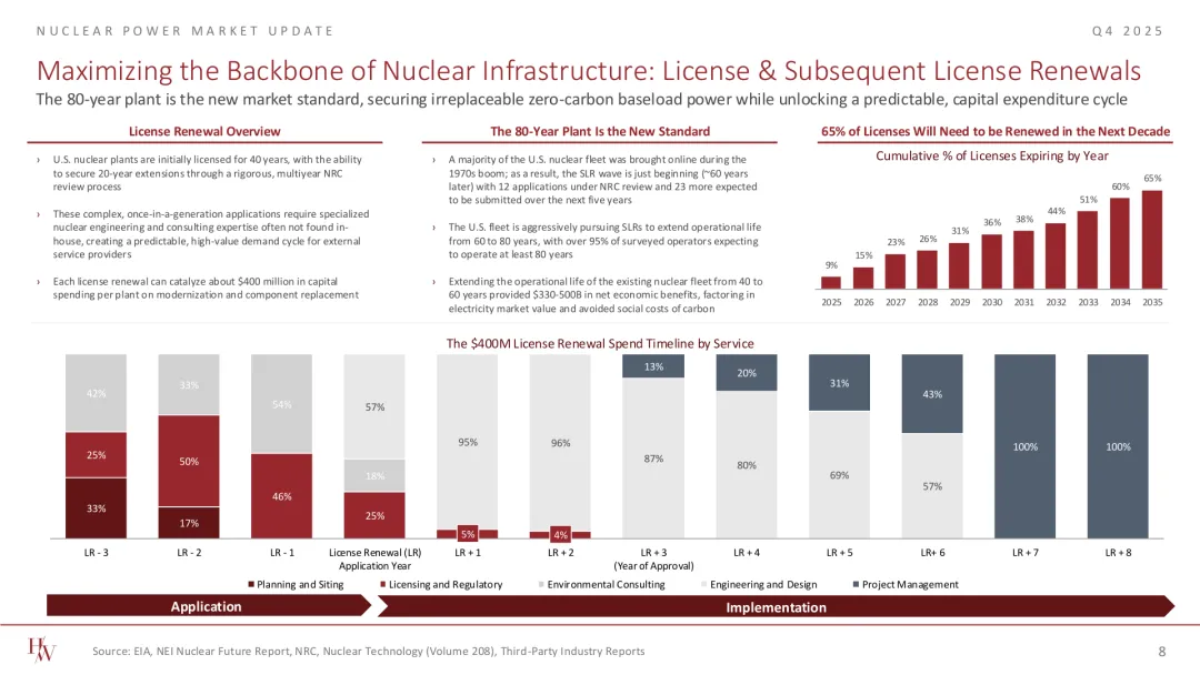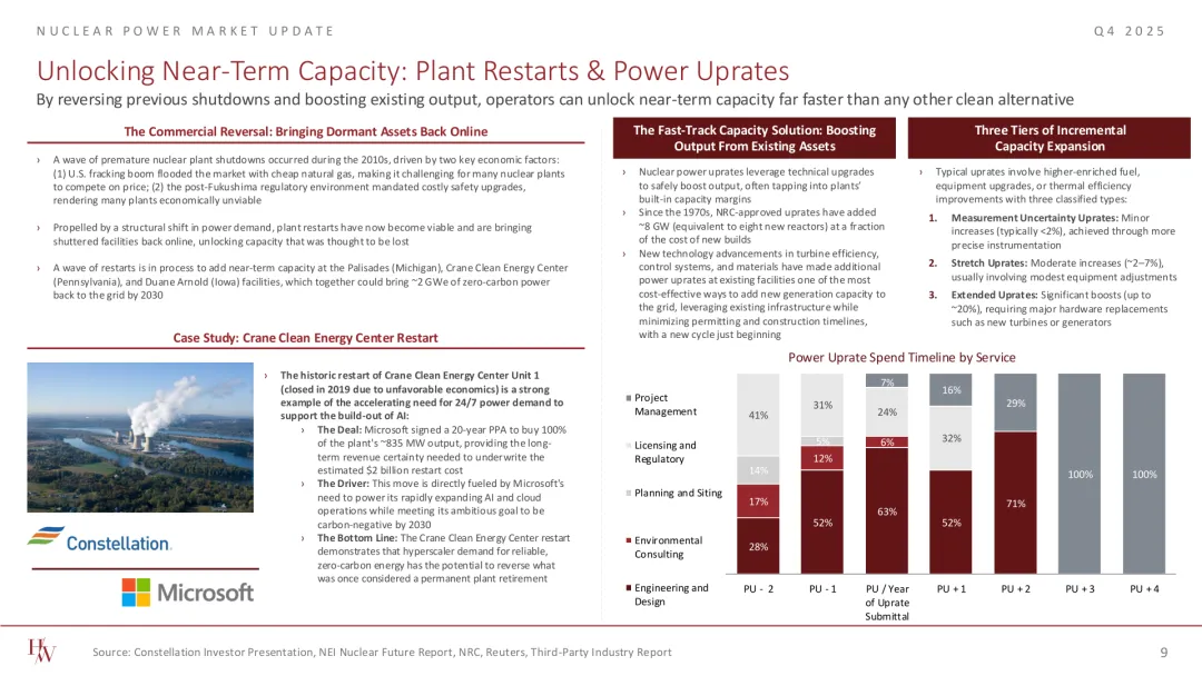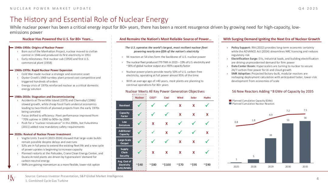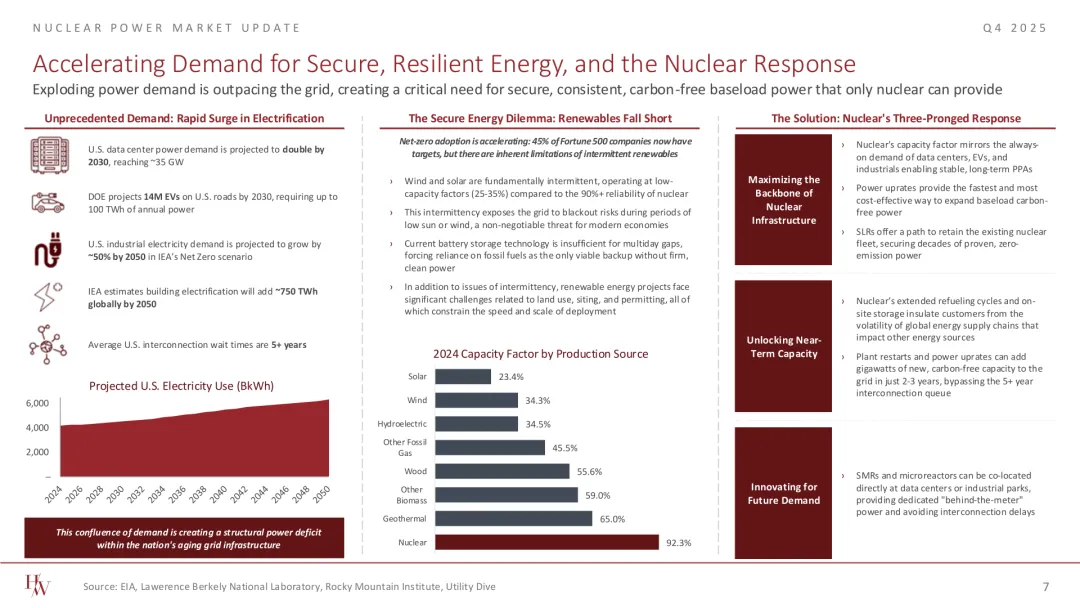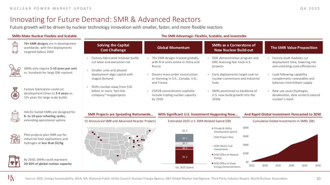 报告聚焦全球核电行业复苏态势,剖析政策支持、需求增长与技术创新三大核心驱动力。核电作为可靠的低碳能源,已稳定供电 80 余年,美国现有 94 座反应堆贡献全国 19% 的电力,占碳 - free 电力近 50%,容量因子保持 90% 以上的高水平。行业复苏得益于多重利好,IRA、ADVANCE Act 等政策提供长期经济保障与监管简化,电动汽车普及、工业回流及 AI 数据中心扩张催生巨额电力需求,传统可再生能源间歇性短板凸显核电不可替代性。市场通过三类路径扩容,既有核电厂许可证续期延长运营至 80 年,闲置电厂重启与功率升级快速补充产能,小型模块化反应堆商业化加速提供灵活解决方案。全球核电投资热度攀升,并购活动活跃,SMR 相关项目与资金投入持续增长。报告预测,2035 年前全球将新增 56 座反应堆,2050 年全球核电容量有望较 2024 年实现 2.6 倍增长,核电正成为全球脱碳与能源安全的核心支撑。