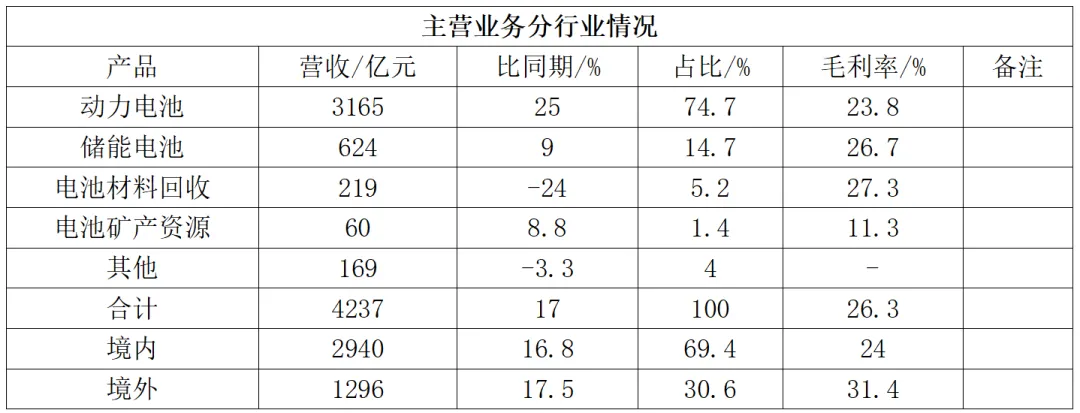 2025年全年实现营业总收入4237亿元,同比增长17%,整体经营规模持续领跑全球电池行业。