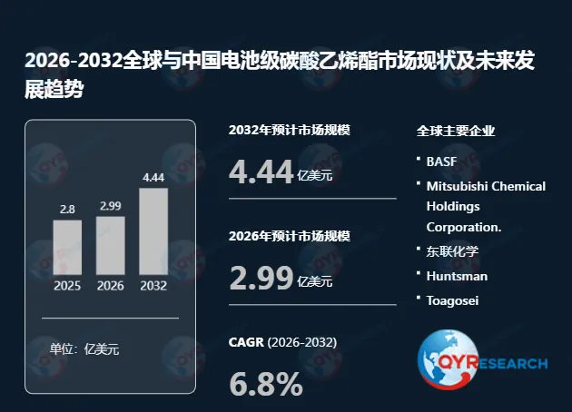 根据QYR(恒州博智)的统计及预测,2025年全球电池级碳酸乙烯酯市场销售额达到了2.80亿美元,预计2032年将达到4.44亿美元,年复合增长率(CAGR)为6.8%(2026-2032)。