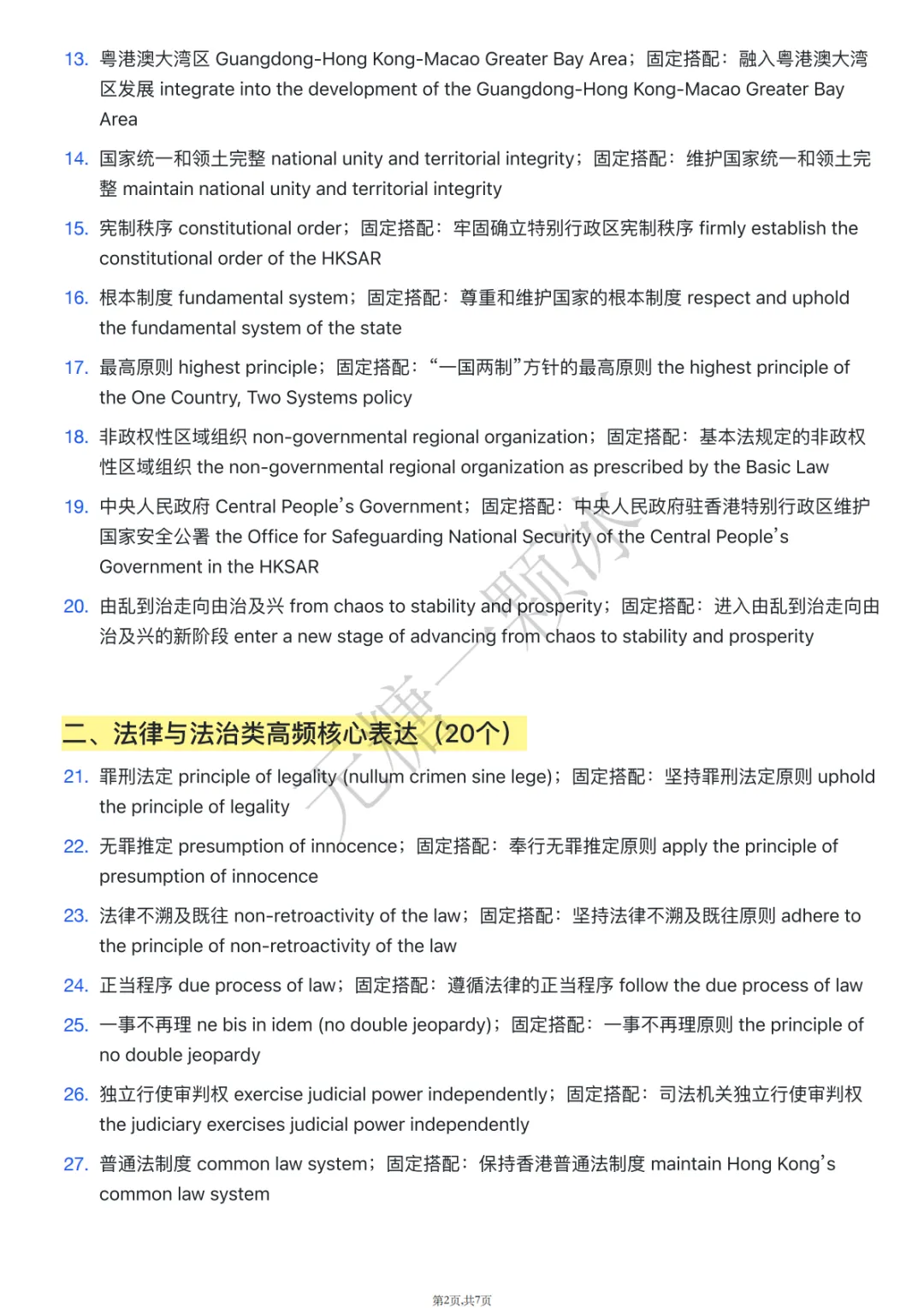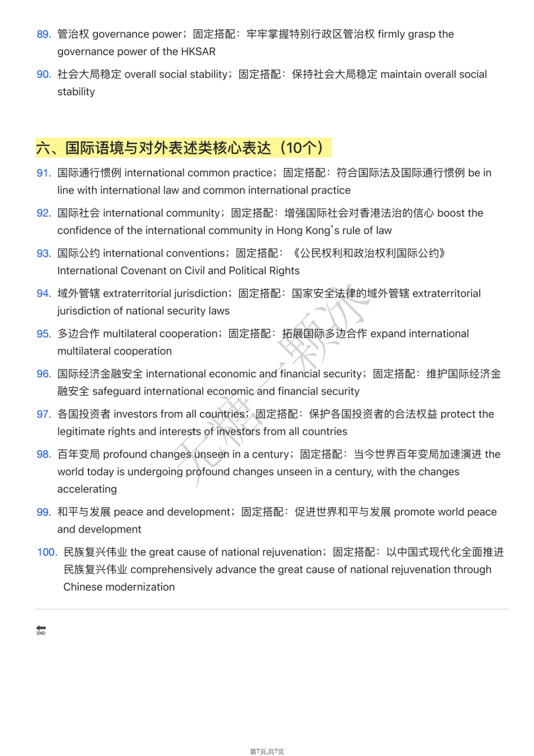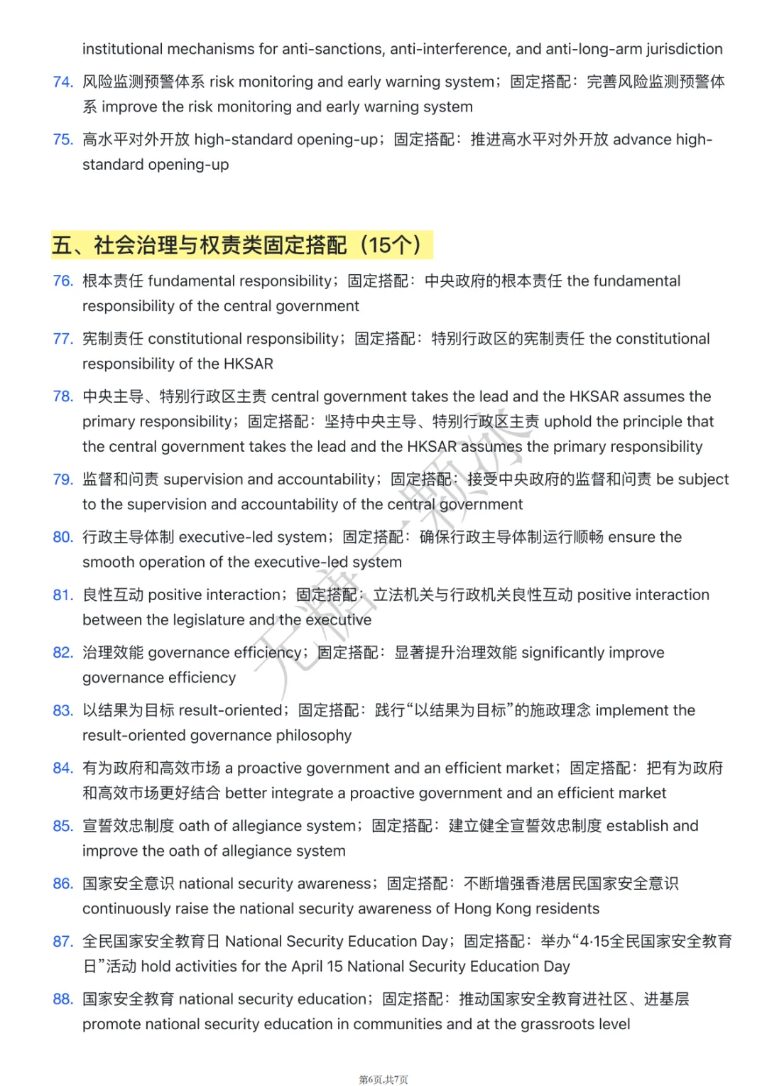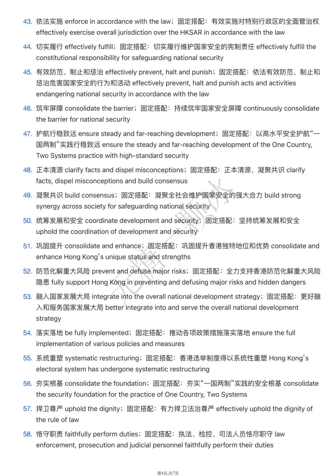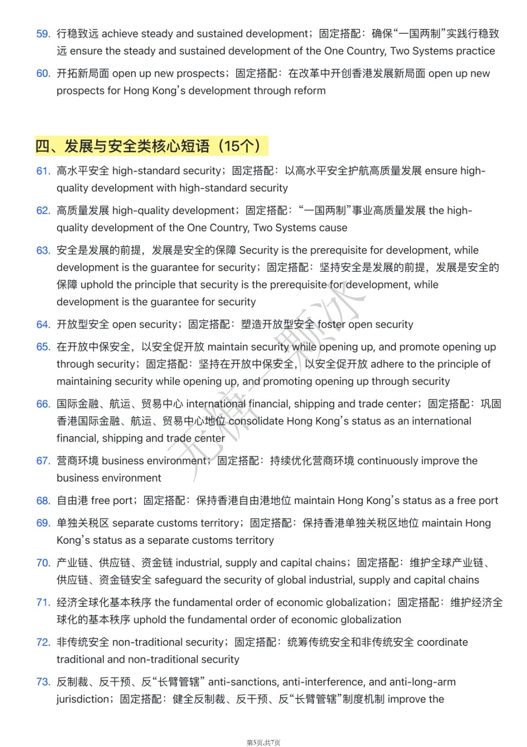 国际⾦融、航运、贸易中⼼ international financial, shipping and consolidate Hong Kong’s status as an internationalfinancial, shipping and trade center营商环境 business environment;固定搭配:持续优化营商环境 continuously improve the固定搭配:保持⾹港⾃由港地位 maintain Hong Kong’s status 单独关税区 separate customs territory;固定搭配:保持⾹港单独关税区地位 maintain HongKong’s status as a separate customs territory产业链、供应链、资⾦链 industrial, supply and capital chains;供应链、资⾦链安全 safeguard the security of global industrial, supply and capital chains经济全球化基本秩序 the fundamental order of economic 固定搭配:维护经济全球化的基本秩序 uphold the fundamental order of economic globalization