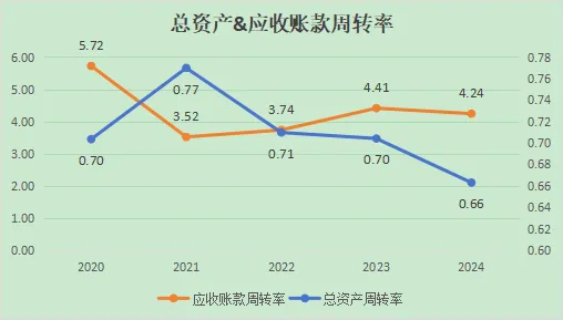 总资产周转率在2021年达到高点后一路下滑至2024年的不足0.7,应收账款周转率在2021年的低点之后逐年提升。一般来说,两项指标应该是同升同降,但是看这张图才发现这两项指标基本完美的走出个反向走势。