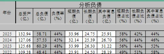 2025年资产负债率44%,短期负债和长期负债较为均衡,其中有息负债25.91亿元,占比44%。