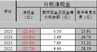 2022-2025年净现金均为负值。