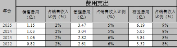 2025年销售、管理、研发占销售收入比例分别为2%、5%、9%。