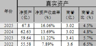 净资产处于逐年增长状态,净资产收益率逐年上涨,2025年为16.06%,商誉占比4.5%。