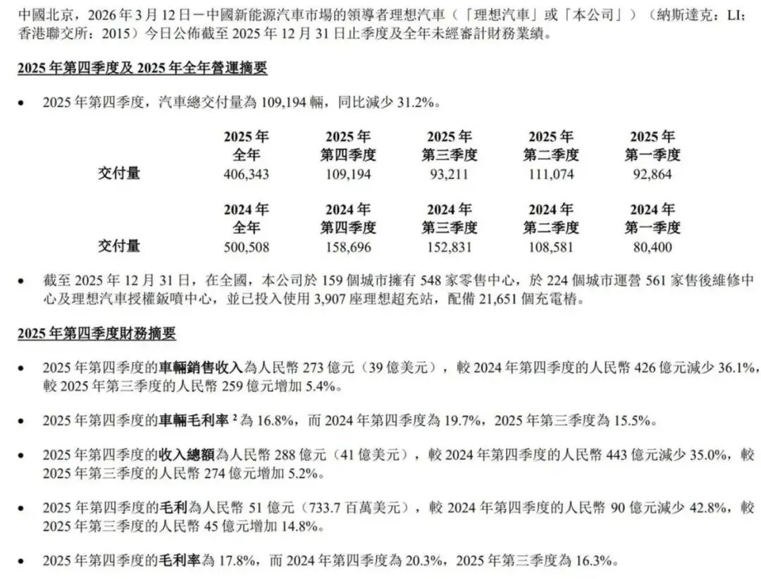 理想汽车2025年的财报数据,确实让不少人感到意外:全年营收1123亿元,同比下滑22.3%;净利润为11.39亿元,同比跌幅为85.8%。