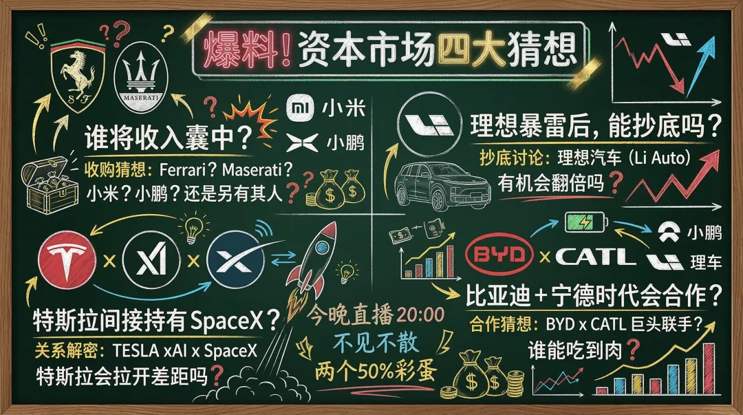 豪华品牌收购会花落谁家?理想现在到底该抄底还是继续等?特斯拉和 SpaceX 的资本关系,到底会不会改写新能源车企的估值逻辑?