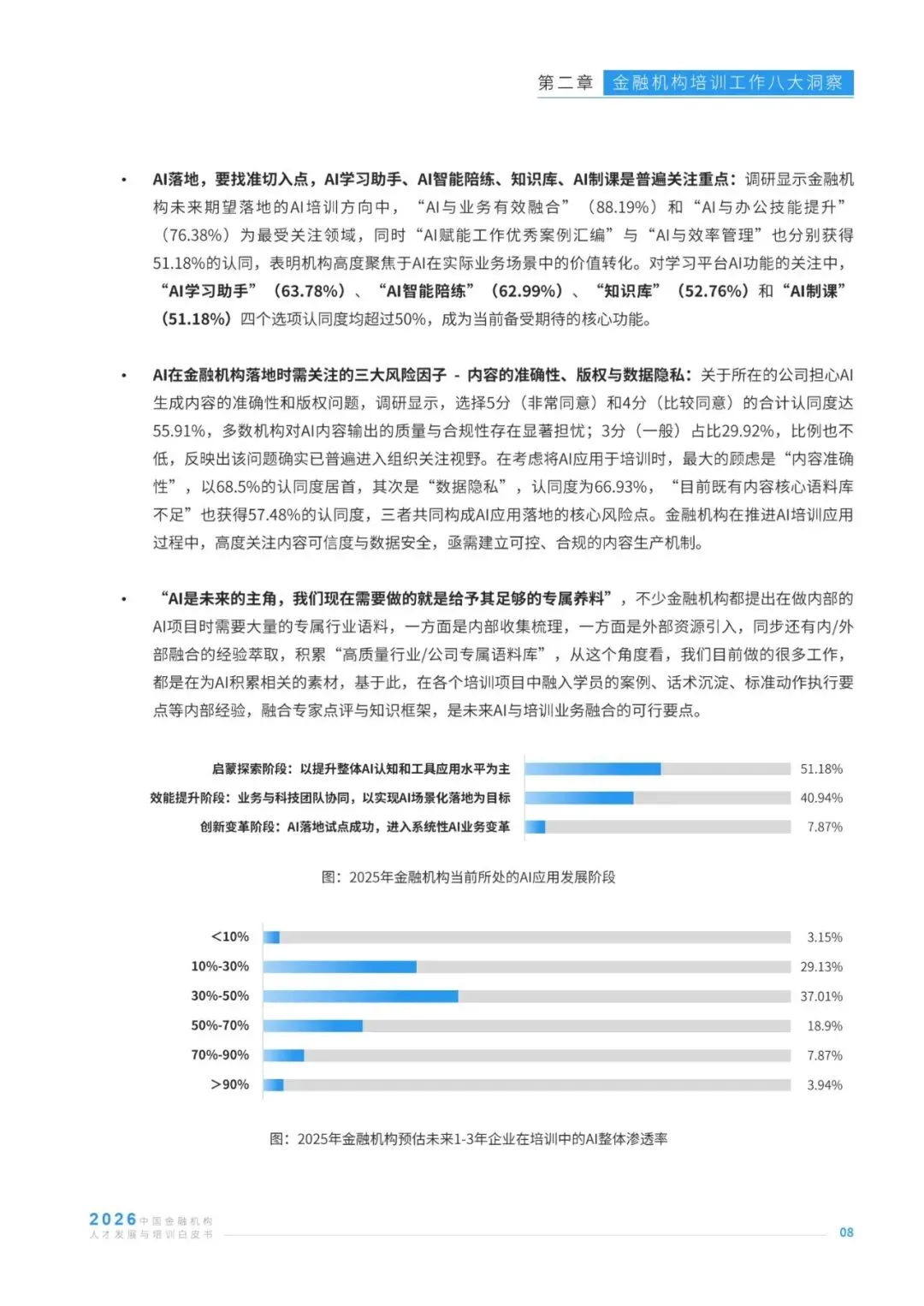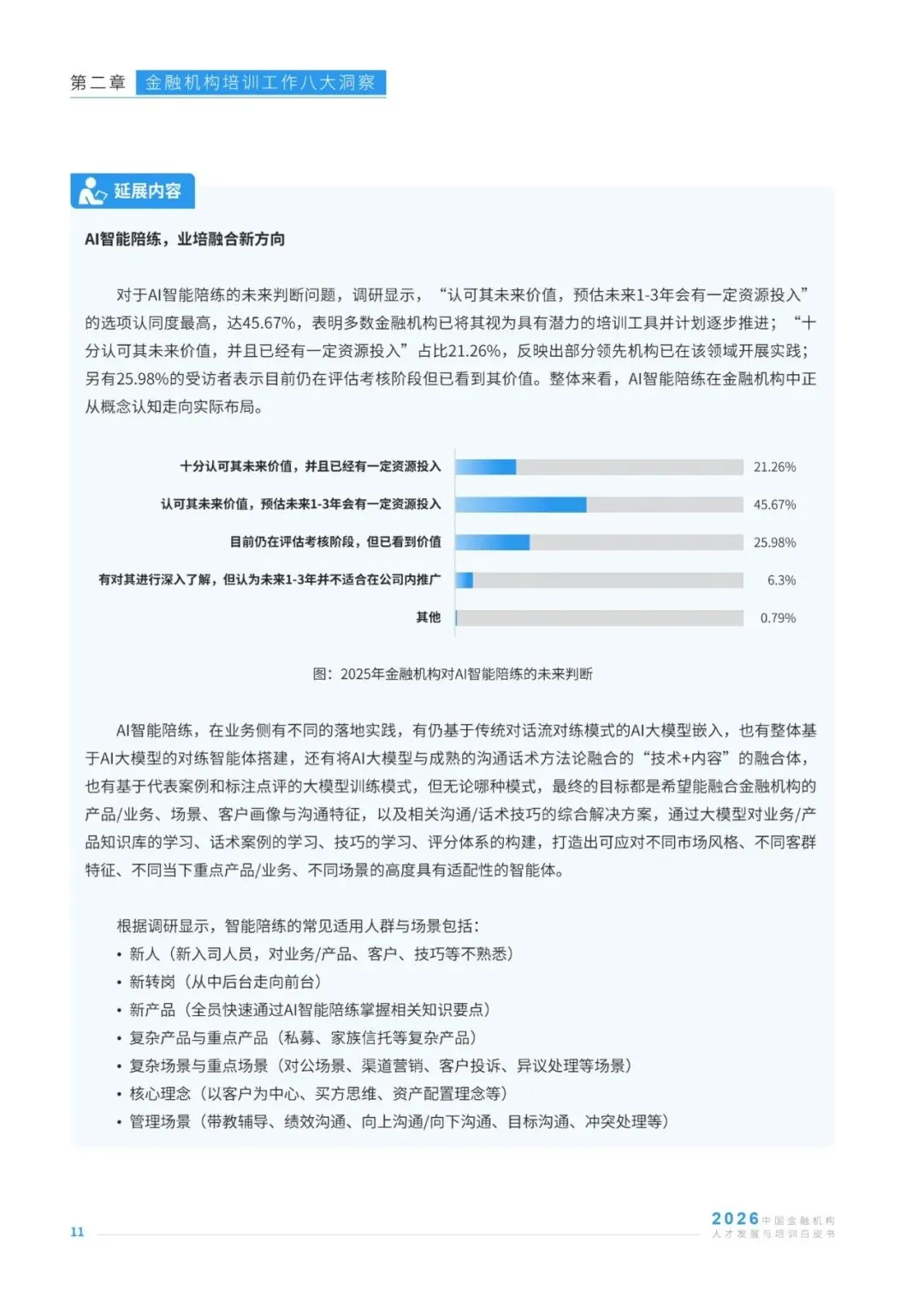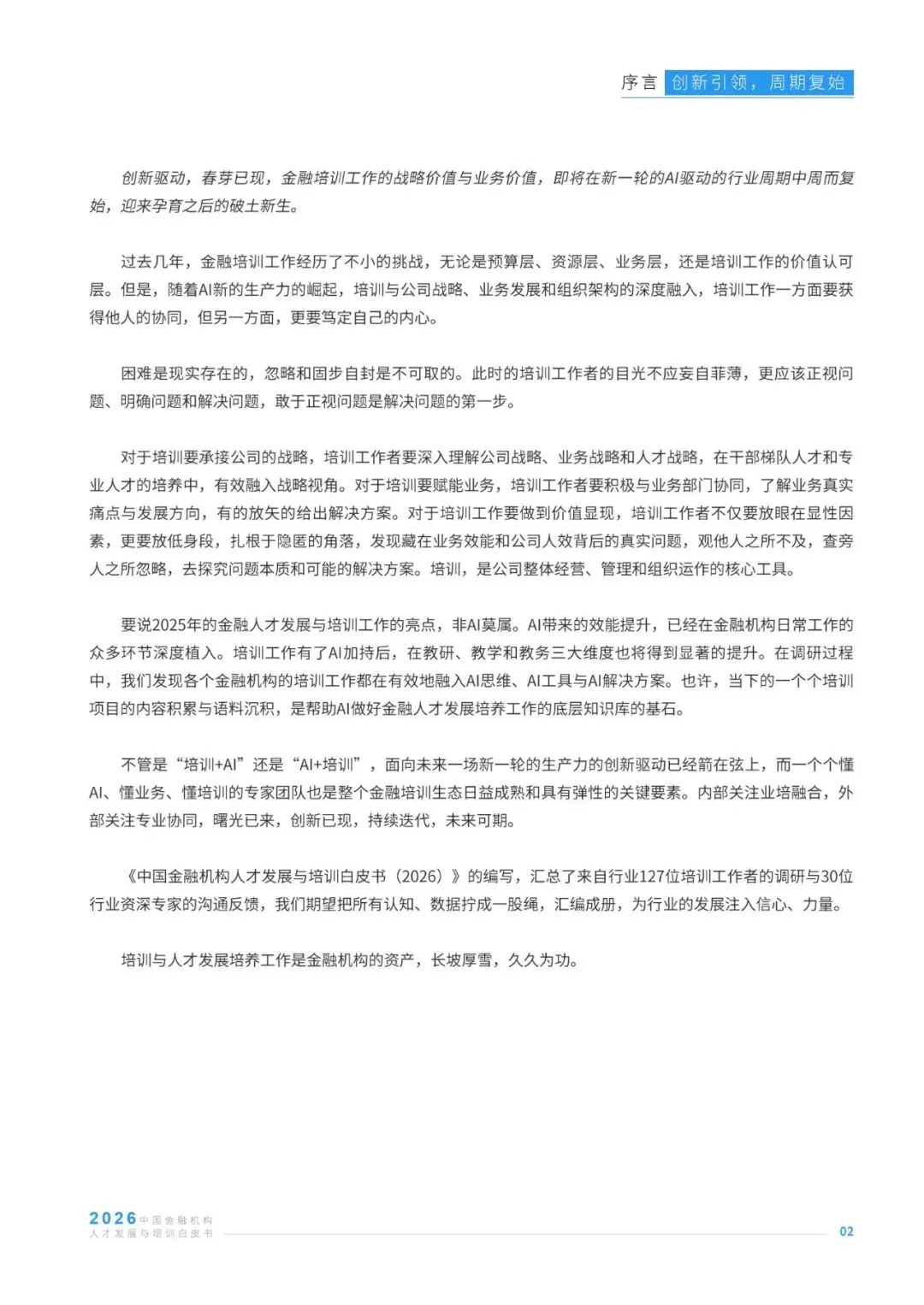 在AI技术深度重塑金融行业发展格局的背景下,金融机构人才发展与培训工作迎来战略升级的关键节点,其战略价值与业务价值的释放成为行业核心关注方向。本报告基于127位金融机构培训从业者、96家人才发展服务商的调研数据,及30位行业资深专家的访谈反馈,聚焦金融培训行业发展现状,从AI渗透、业培融合、经验内化、体系认证等八大维度,剖析行业实践中的痛点、需求与趋势,同时洞察培训机构的发展挑战与经营方向。报告清晰呈现了当前金融培训在AI工具应用、培训成果量化、知识资产沉淀、预算与供应商管理等方面的核心特征,也明确了业培深度融合、AI与培训全链路结合、培训价值显性化等行业发展主线,为金融机构优化人才培养体系、培训机构升级服务能力提供了兼具数据支撑与实践指导的专业参考,助力行业在数智化浪潮中构建适配的人才发展范式。