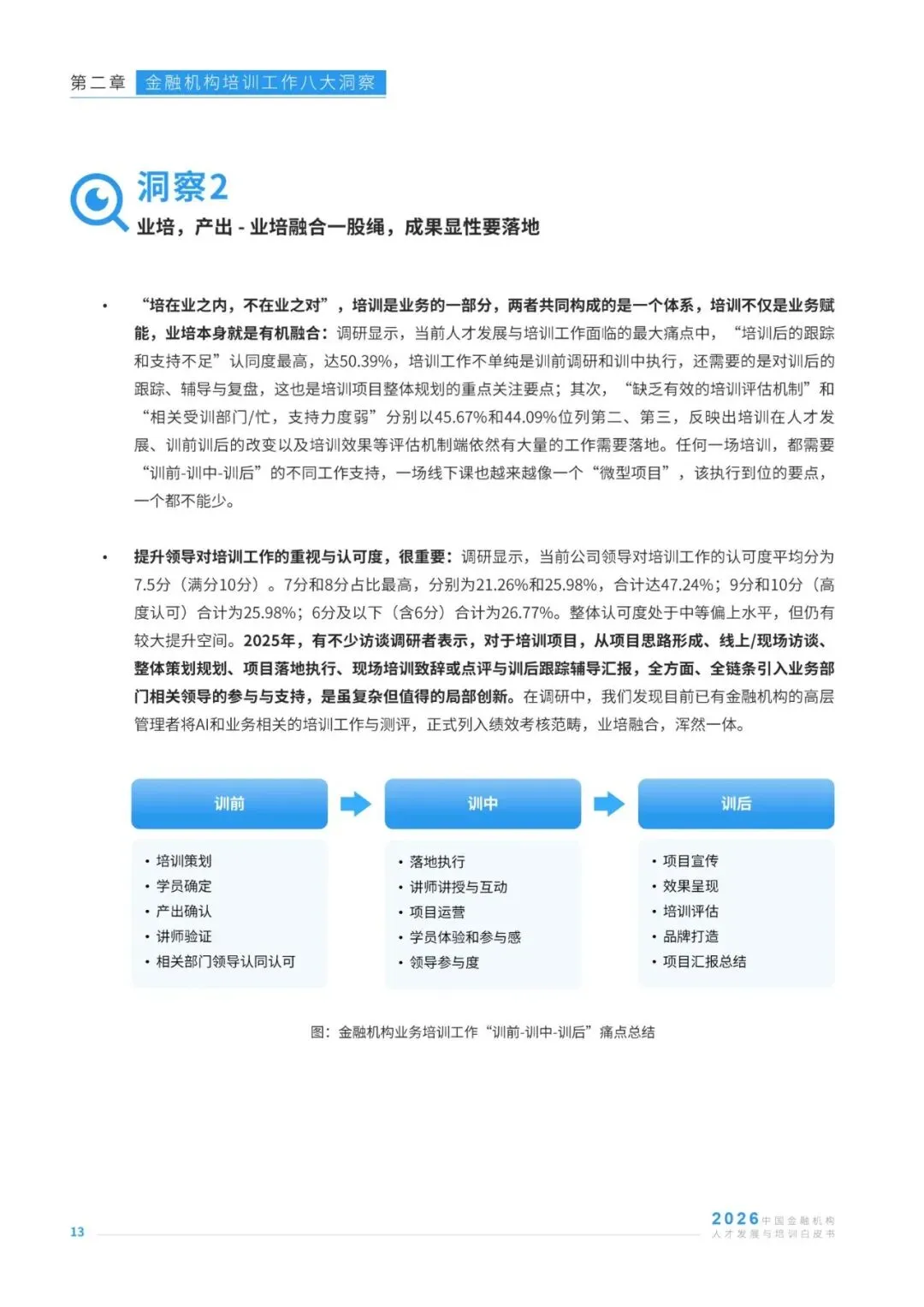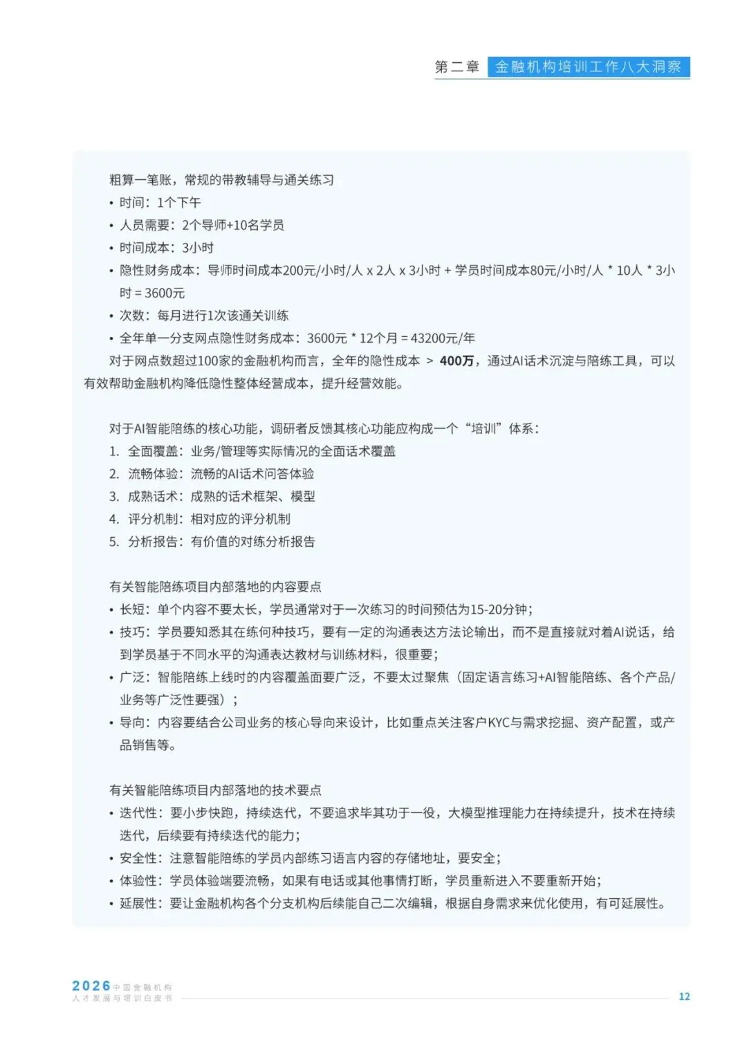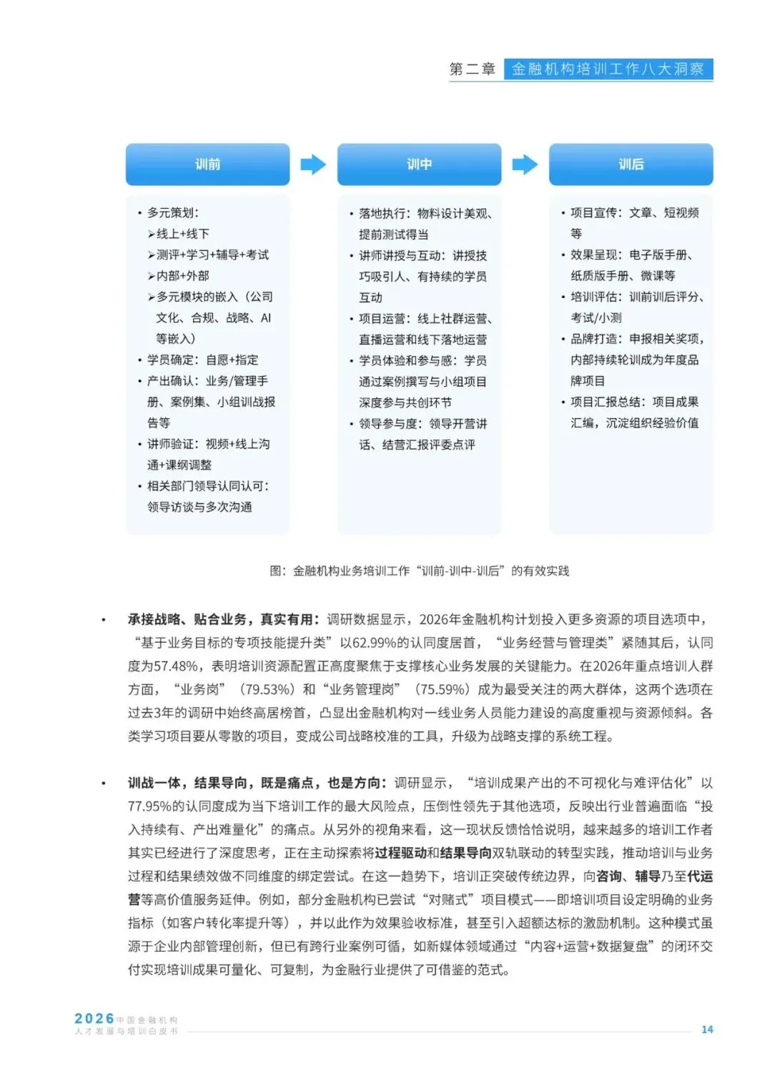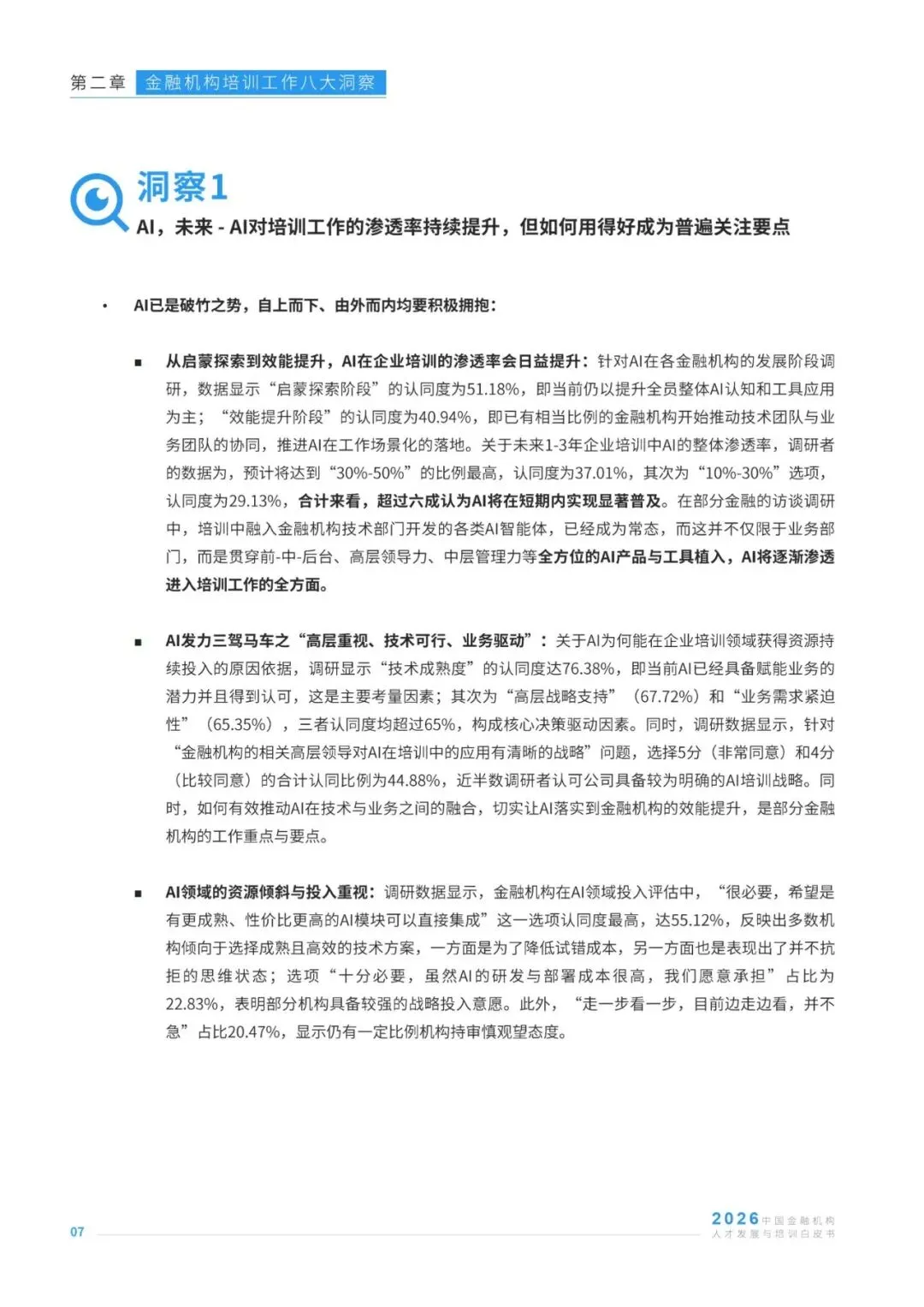 在AI技术深度重塑金融行业发展格局的背景下,金融机构人才发展与培训工作迎来战略升级的关键节点,其战略价值与业务价值的释放成为行业核心关注方向。本报告基于127位金融机构培训从业者、96家人才发展服务商的调研数据,及30位行业资深专家的访谈反馈,聚焦金融培训行业发展现状,从AI渗透、业培融合、经验内化、体系认证等八大维度,剖析行业实践中的痛点、需求与趋势,同时洞察培训机构的发展挑战与经营方向。报告清晰呈现了当前金融培训在AI工具应用、培训成果量化、知识资产沉淀、预算与供应商管理等方面的核心特征,也明确了业培深度融合、AI与培训全链路结合、培训价值显性化等行业发展主线,为金融机构优化人才培养体系、培训机构升级服务能力提供了兼具数据支撑与实践指导的专业参考,助力行业在数智化浪潮中构建适配的人才发展范式。