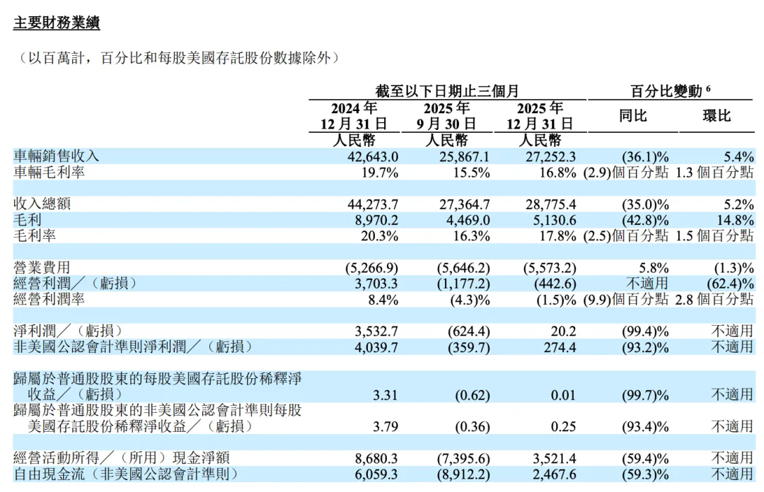 当然,理想也不是没有问题。2025年四季度营收287.8亿元,同比下滑35%,汽车毛利率也从上年同期的19.7%降至16.8%。这说明它的纯电转型、产品切换和价格竞争,确实都在吞噬短期利润。