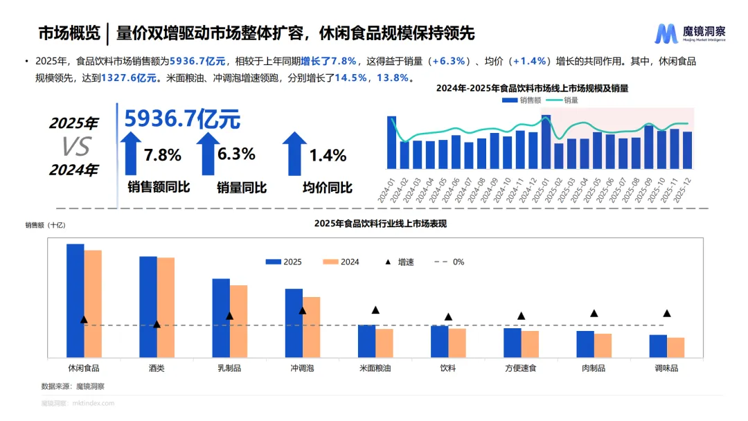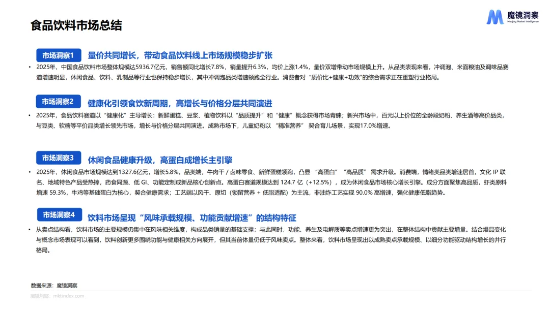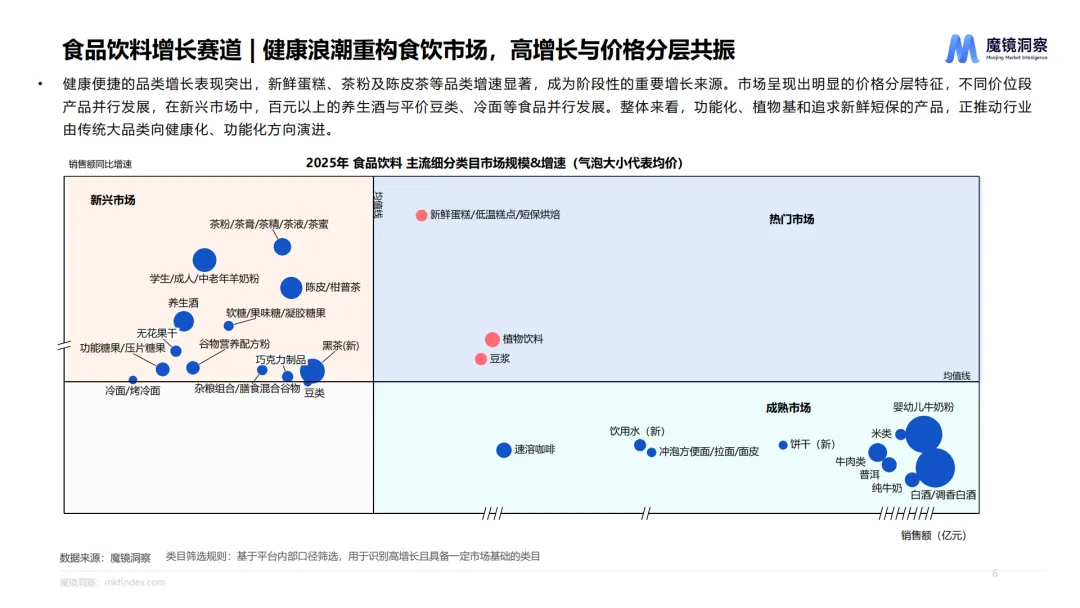2025年中国消费市场整体保持量价齐升、结构升级,健康化、精准化、场景化贯穿食品饮料、大健康、家电、美妆、3C数码、母婴六大核心赛道。消费者更看重成分、功效与生活适配度,品牌竞争转向技术创新、人群细分与情绪价值,AI渗透、国补落地、内容电商共同推动行业快速迭代。