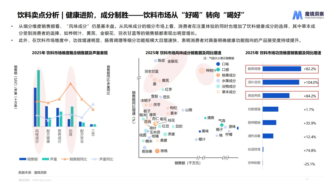 食品饮料靠高蛋白与养生饮品拉动,大家更在意吃得健康、功能明确。大健康集中在改善贫血和脑营养,主动预防的养生需求覆盖全年龄段。家电受益于以旧换新政策,智能门锁、咖啡机这类智能新品增速突出。美妆核心是抗衰抗皱,全龄段都在追求更高级的护肤体验。3C数码被AI点燃,认证移动电源、AI玩具成为现象级爆款。母婴则是营养补充高速增长,妈妈和宝宝的健康都被精细照顾。