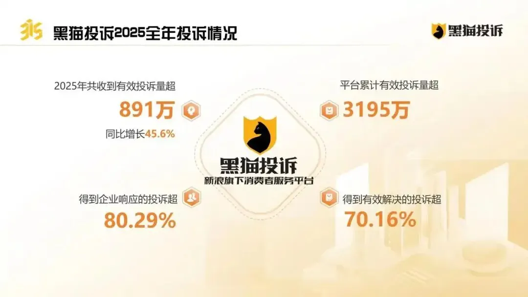 2025年黑猫投诉平台全年有效投诉量891万,截至2025年底,平台累计有效投诉量超3195万,超过8成投诉得到企业响应,超过7成的纠纷得到解决。