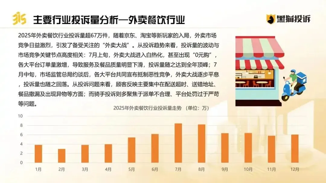 2025年外卖餐饮行业投诉量超67万件,随着京东、淘宝等新玩家的入局,外卖市场竞争日益激烈,引发了备受关注的“外卖大战”。从投诉趋势来看,投诉量的波动与市场竞争关键节点高度相关:7月上旬投诉量达到全年顶峰。从投诉问题来看,顾客反映主要集中在配送超时、送错地址、餐品撒漏及出现异物等方面;而骑手投诉则多聚焦于派单不合理、平台处罚过于严苛等问题。