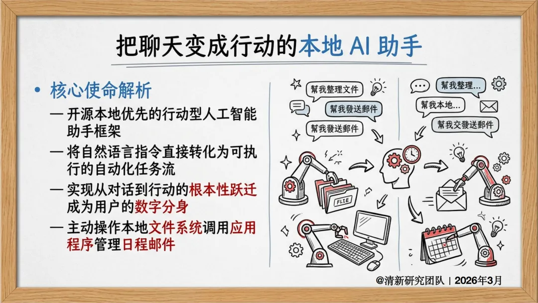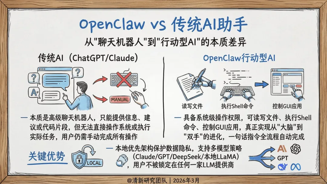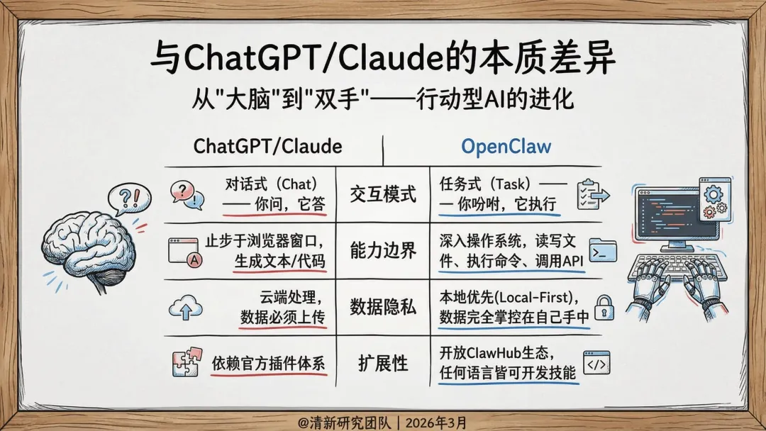 作为本地优先的行动型 AI Agent 框架,其与 ChatGPT/Claude 等传统聊天机器人核心差异在于突破 “对话” 边界,具备系统级操作能力,是从 “大脑” 到 “双手” 的进化;核心优势为 MIT 协议开源免费、本地存储保障隐私、插件化设计极度可扩展、低门槛适配开发者,且支持多模型策略,无厂商锁定。