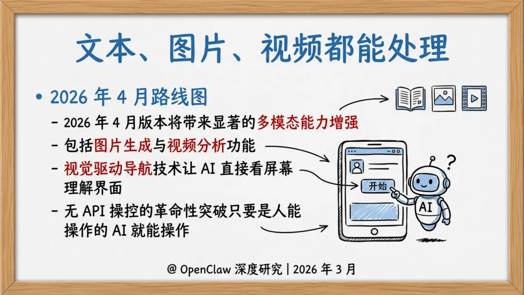 存在 LLM 幻觉(关键决策需人工复核)、法律风险(AI 操作的责任界定)、就业影响(替代重复性工作)等问题;2026 年 4 月将升级多模态能力,新增图片生成、视频分析,实现视觉驱动导航和无 API 操控。