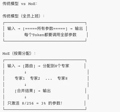 寓言:超级工厂的"按需分配"想象一个超级工厂:有 256 个"专家车间"但每次任务只激活 8 个车间其他车间"待命",不浪费电!这就是 MoE 的核心思想:不是所有专家都要上班,按需分配!