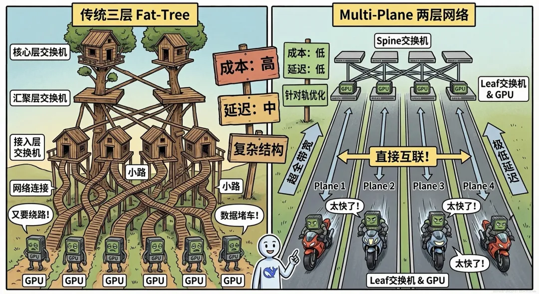 寓言:高速公路 vs 乡间小路如果城市里只有乡间小路,再好的车也跑不起来。DeepSeek-V3 采用了创新的 Multi-Plane Network:传统三层网络 → 两层网络减少 30% 的网络设备成本延迟更低!