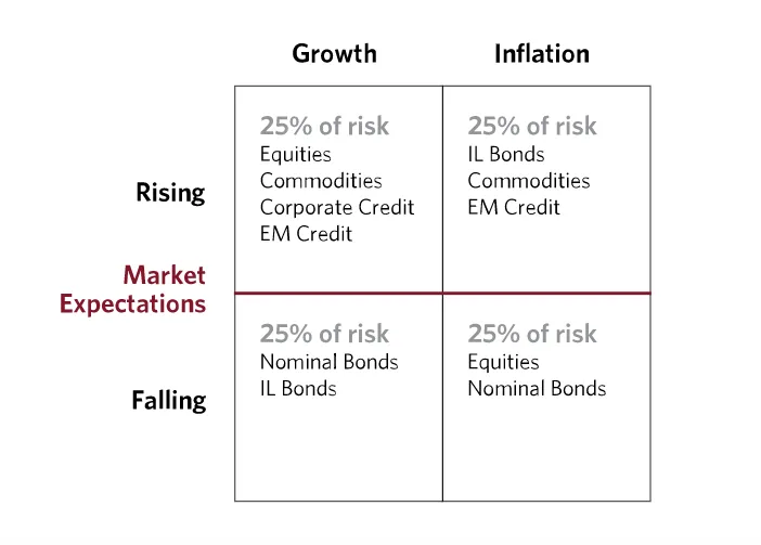 研究发现,所有资产类别都有其偏好的经济环境:债券在通缩性衰退期间表现最佳,股票在经济增长期间表现最佳,现金在货币紧缩时最具吸引力。传统的高股票权重投资组合实际上是在对股票和经济增长下巨大的赌注。基于这一认识,桥水建议使用与股票风险相当的长期债券来对冲经济增长风险,这就是风险平价理念的早期雏形。