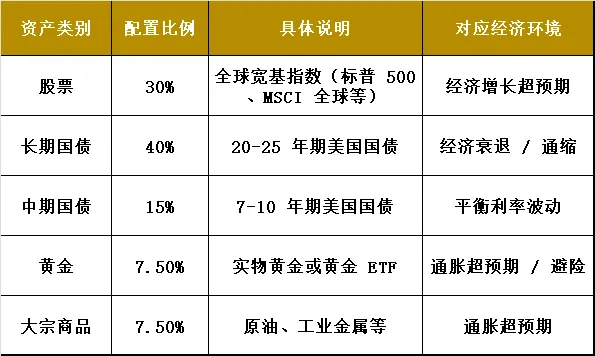 桥水全天候策略的经典配置比例经过数十年的实践验证,形成了相对稳定的结构。根据最新数据,该策略的标准配置如下: