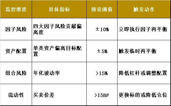利率、通胀、增长、信用四大核心因子各占约 25% 的风险贡献度,单一因子敞口偏离阈值不超过 ±10%