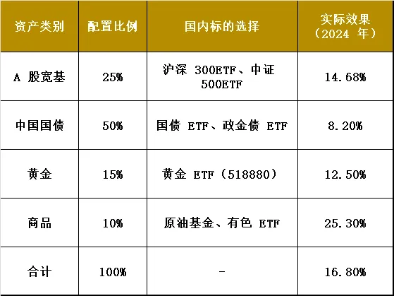 根据中国市场特点,将国债比例提高至 55%,黄金占比增至 10% 以对冲人民币汇率风险。
