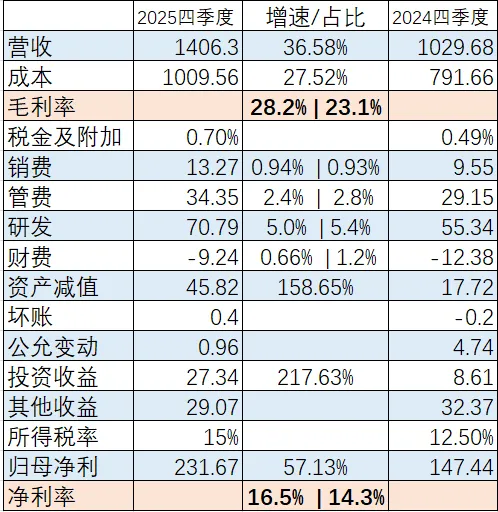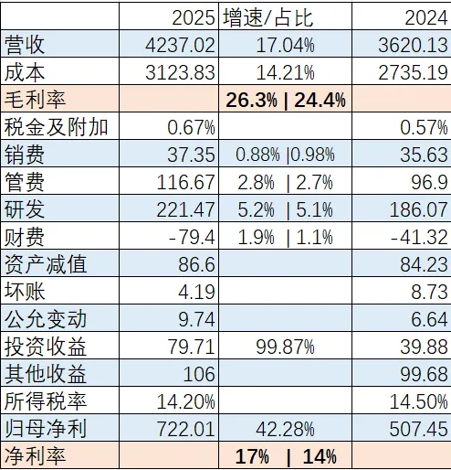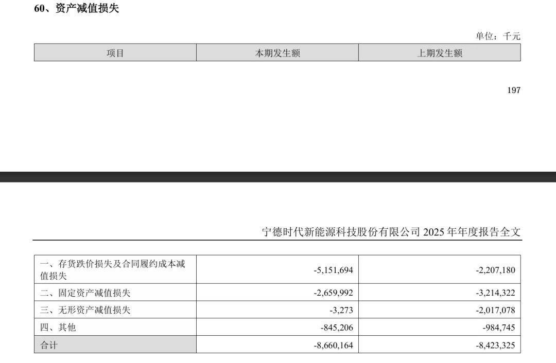 还是老样子,先从利润表开始看,这是我总结过后的四季度和全年利润表乍一看,毛利率提升很多,从23.1%涨到28.2%,说明产品竞争力依旧,四费都稳定控制,但是4四季度有个扎眼的家伙“资产减值”同比提升158.65%,全年来看却是保持在85亿左右,占比反而因营收增加而减少,这个问题一会要特别关注,其他的都发挥正常。动力电池系统营收增速25.08%,动力电池销量增速41.85%,说明电池单价在下降,毛利率下降0.1%。储能电池系统营收增速26.71%,储能电池销量增速29.13%,同样储能电池单价也在下降,毛利率下降0.13%。那毛利率提升这么多是哪来的呢?往下看可以看到电池材料及回收的毛利率涨幅达到惊人的16.76%,这就是宁王全年毛利率上升的主要原因。直接材料的占比从76.48%降到71.79%,刚上市那几年占比是在80%左右,现在降了10%,但绝对值还在增加,那原因只有一个,直接材料的价格控制在小范围浮动,从管理层口中得知,宁德时代这些年来与下游车企的动力电池合同普遍设有碳酸锂价格联动机制,传导周期约1至2个月。原材料涨了,成本在一两个月内就能往下传。同时,宁德在上游持有矿产股权,邦普循环全年回收废旧电池及材料21万吨,还有近3700亿元名义本金的衍生品套期保值锁定敞口。碳酸锂涨,联动机制传导成本,上游持股分享涨价收益。碳酸锂跌,低价囤货和回收渠道充分释放降本红利。两个方向都有对冲,单Wh净利就稳在0.1元/Wh附近。对比之下,多数二线企业在上行周期被成本挤压,下行周期又缺乏锁价工具,两头被动。