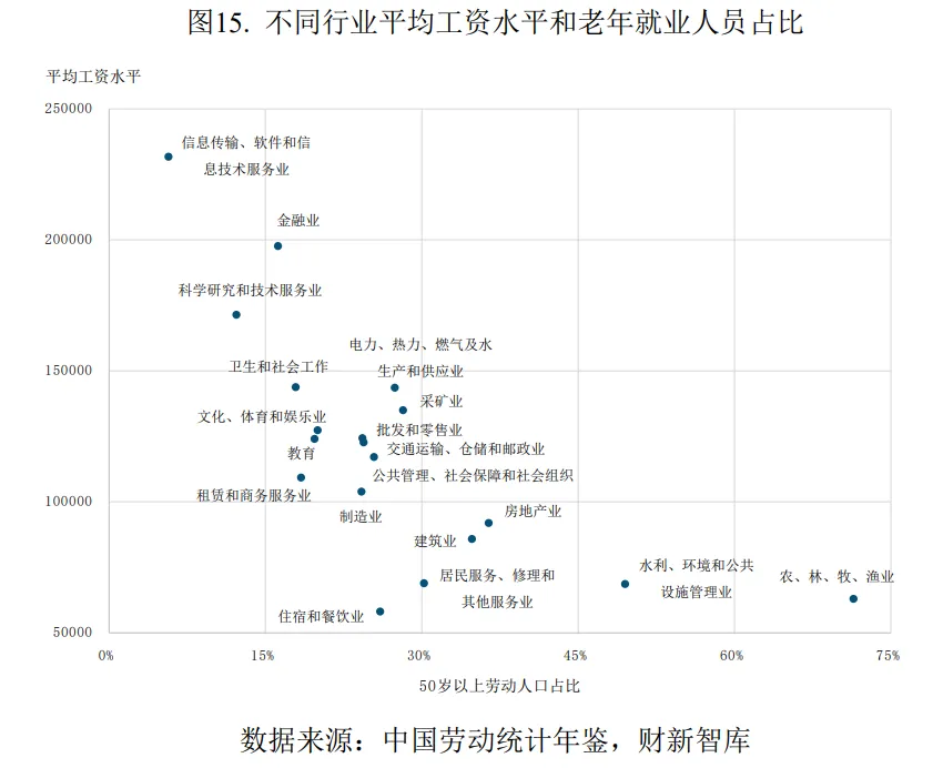 延迟退休对劳动力市场的影响因行业而异。对于教育、卫生等依赖知识储备与经验积累的行业,延迟退休有利于人力资源的充分利用。但对于农业、建筑业等依赖体力的行业,以及偏好年轻化团队的互联网、金融行业,延迟退休将带来新的挑战。报告显示,在收入较高的信息传输、软件和信息技术服务业,50岁以上员工占比仅6%,行业“35岁门槛”现象与延迟退休政策形成鲜明对比。