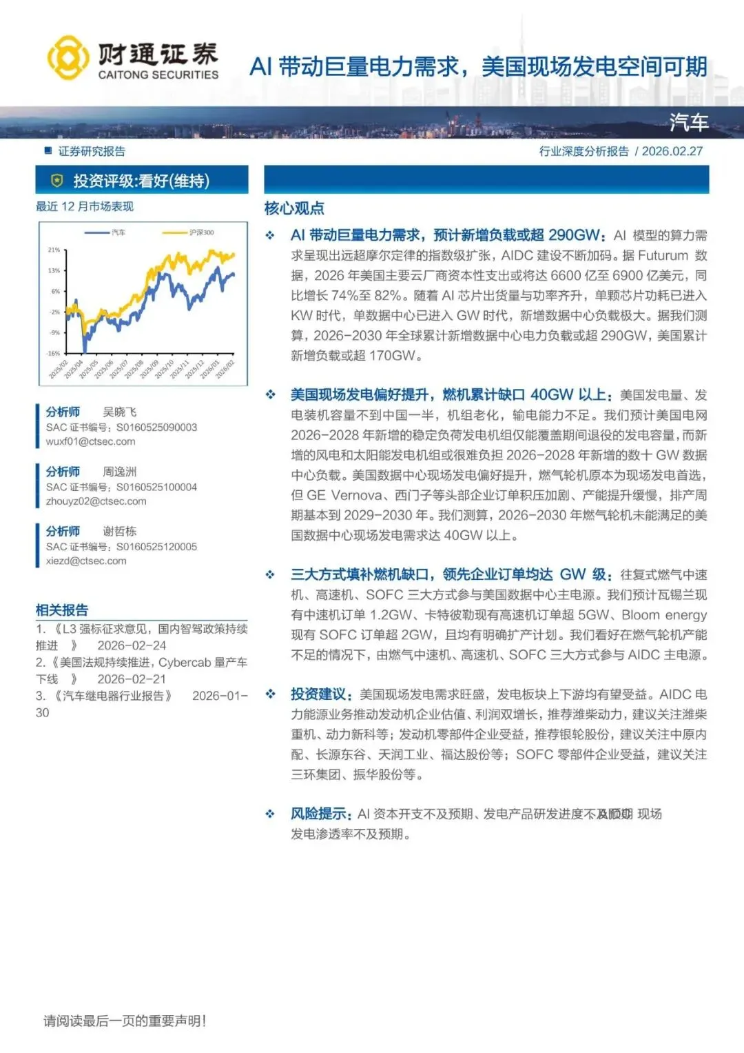 回复暗号:汽车行业深度分析报告:AI带动巨量电力需求,美国现场发电空间可期-260227-财通证券-26页