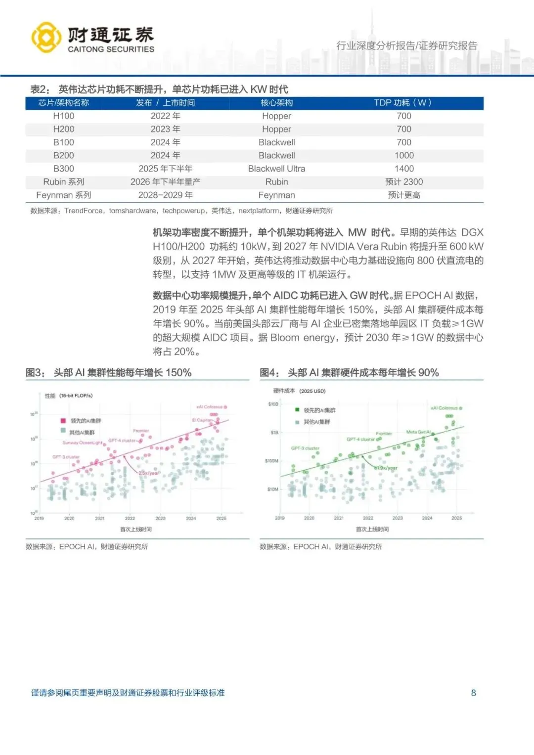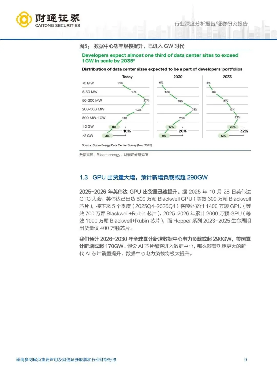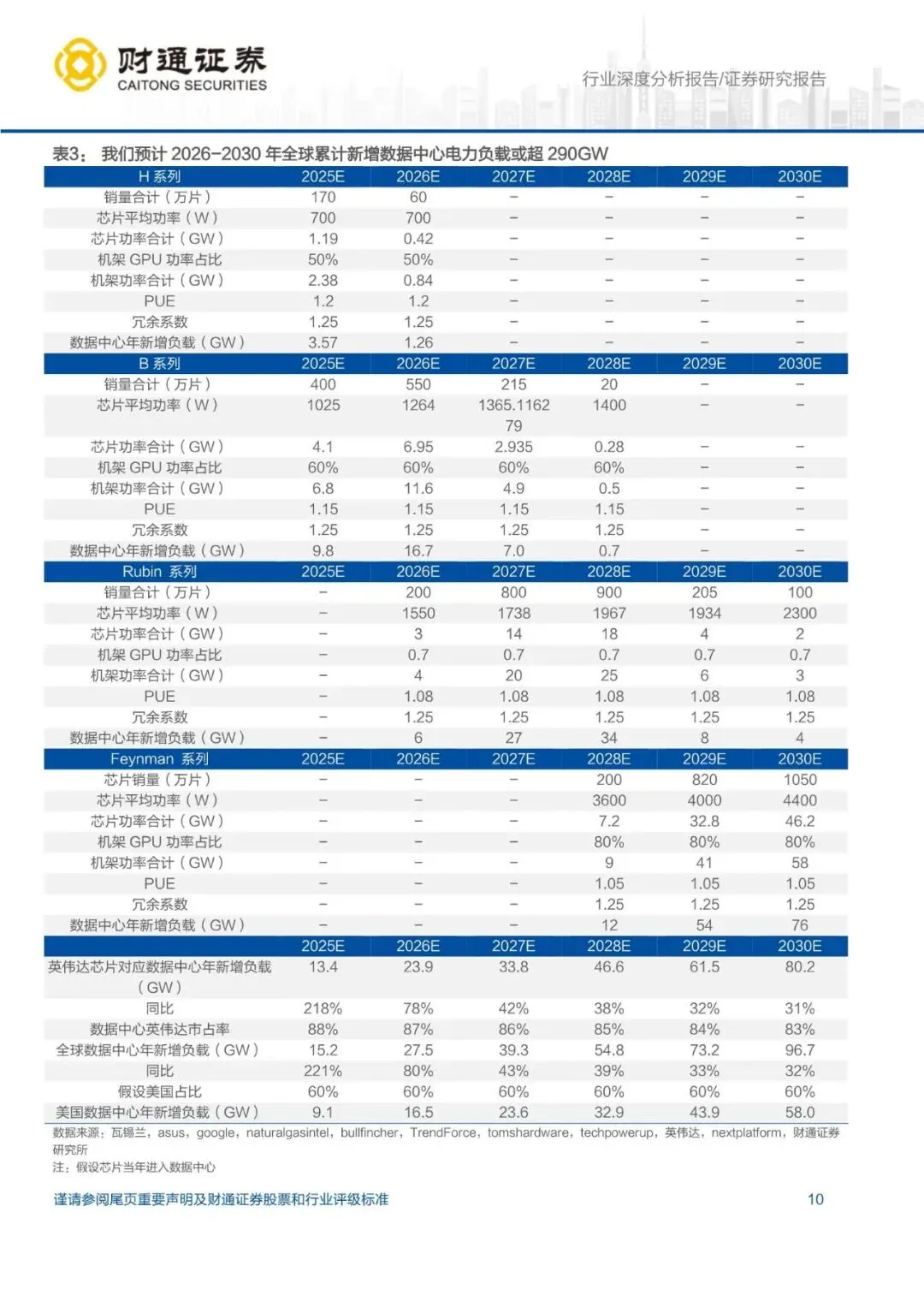 AI 带动巨量电力需求,预计新增负载或超 290GW:AI 模型的算力需求呈现出远超摩尔定律的指数级扩张,AIDC 建设不断加码。据 Futurum 数据,2026 年美国主要云厂商资本性支出或将达 6600 亿至 6900 亿美元,同比增长 74%至 82%。随着 AI 芯片出货量与功率齐升,单颗芯片功耗已进入KW 时代,单数据中心已进入 GW 时代,新增数据中心负载极大。据我们测算,2026-2030 年全球累计新增数据中心电力负载或超 290GW,美国累计新增负载或超 170GW。
