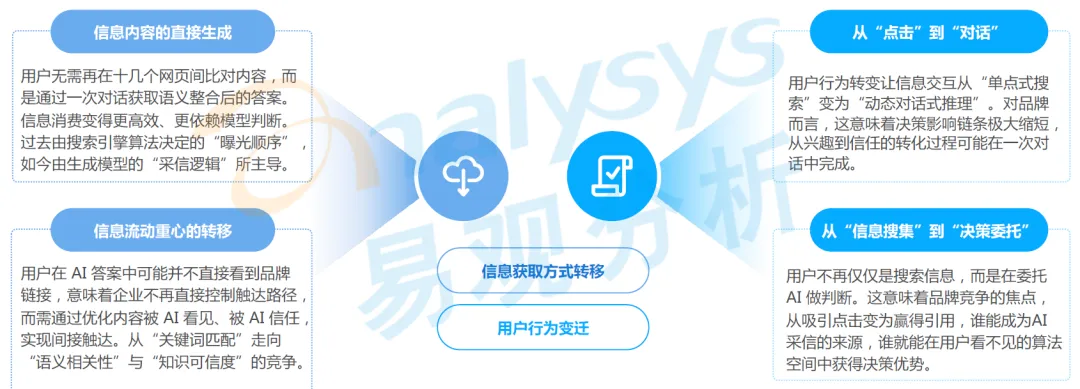 生成式 AI 的兴起正引发信息获取范式的根本性转移,AI 生成引擎不再输出链接列表,而是直接生成经过模型推理、语义整合与多源引用的综合式答案,信息流动的重心从 “搜索与点击” 全面转向 “生成与引用”,用户行为的变迁成为这一转移最核心的驱动力,具体体现在四大维度: