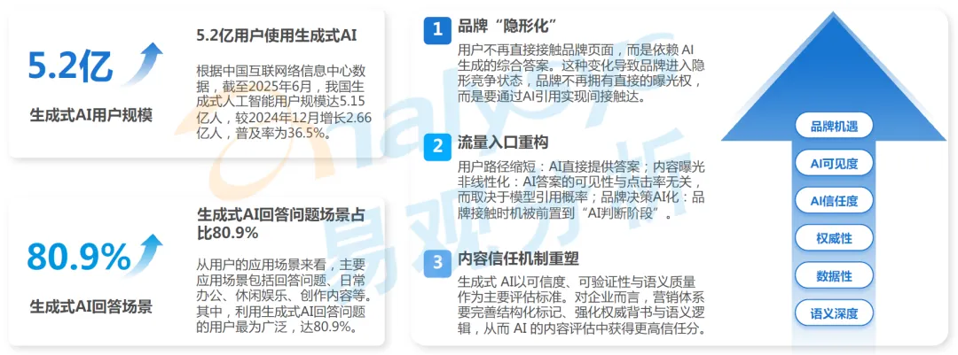 流量入口重构:核心体现在三大变化,一是用户决策路径大幅缩短,AI 可直接提供完整答案;二是内容曝光呈现非线性化特征,AI 答案的可见性与点击率无关,核心取决于模型的引用概率;三是品牌接触用户的时机被前置到 AI 判断阶段,传统的用户触达逻辑被彻底重构。