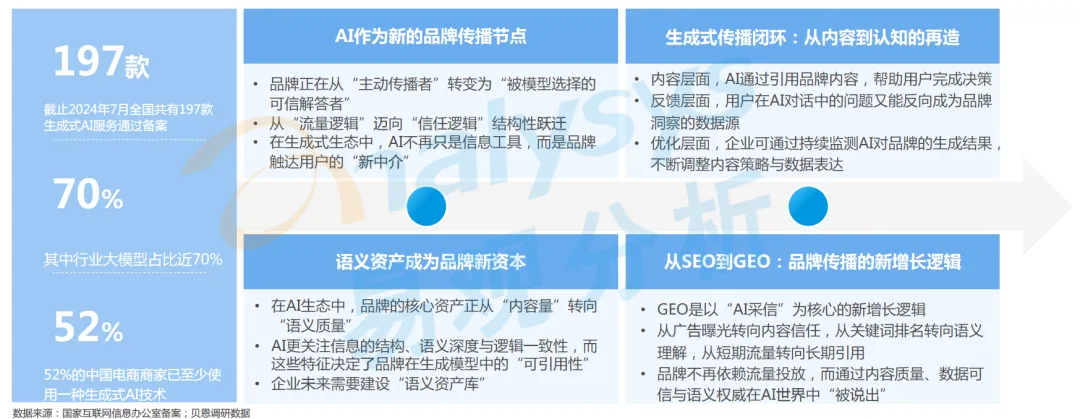 品牌角色实现结构性跃迁:品牌正在从 “主动传播者” 转变为 “被模型选择的可信解答者”,实现从 “流量逻辑” 到 “信任逻辑” 的结构性跃迁,AI 不再只是信息工具,而是品牌触达用户的全新核心中介。截至 2024 年 7 月,全国共有 197 款生成式 AI 服务通过备案,其中行业大模型占比近 70%,AI 生态的快速完善为品牌提供了全新的传播节点。