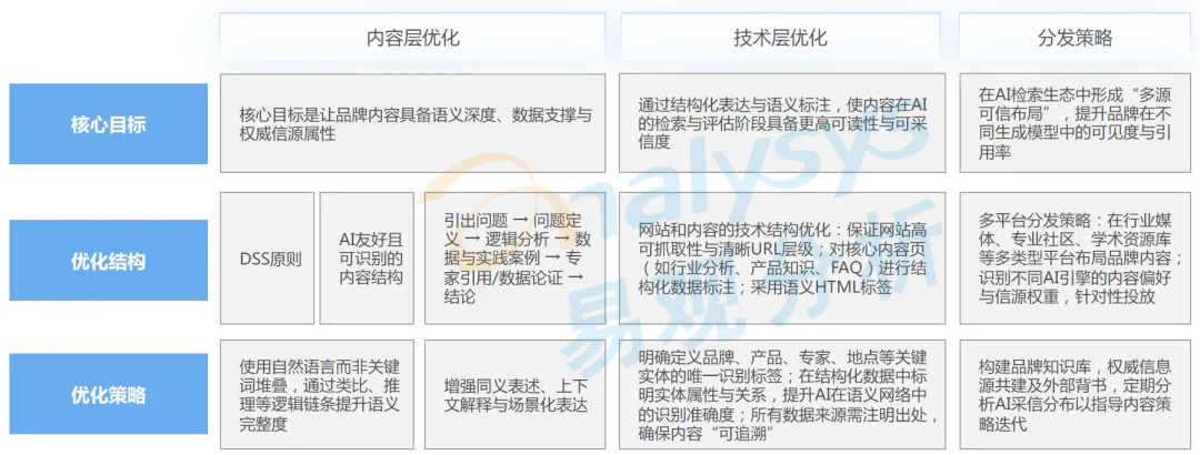 内容层优化的核心目标,是让品牌内容具备语义深度、数据支撑与权威信源属性,核心是遵循 DSS 原则,使用自然语言而非关键词堆叠,通过类比、推理等逻辑链条提升语义完整度,同时增强同义表述、上下文解释与场景化表达,适配 AI 的语义理解逻辑。