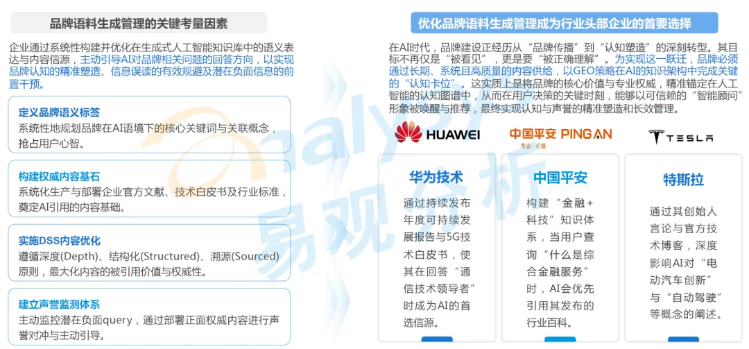 该场景的核心落地举措包括:系统性定义品牌语义标签,规划品牌在 AI 语境下的核心关键词与关联概念,抢占用户心智;建立声誉监测体系,主动监控潜在负面 query,通过部署正面权威内容进行声誉对冲与主动引导;严格遵循 DSS 原则实施内容优化,最大化内容的被引用价值与权威性;构建权威内容基石,系统化生产与部署企业官方文献、技术白皮书及行业标准,奠定 AI 引用的内容基础。目前华为、中国平安、特斯拉等企业已在该场景形成成熟实践,例如中国平安通过构建 “金融 + 科技” 知识体系,使用户查询 “什么是综合金融服务” 时,AI 会优先引用其发布的行业百科,实现了品牌认知的精准传递。