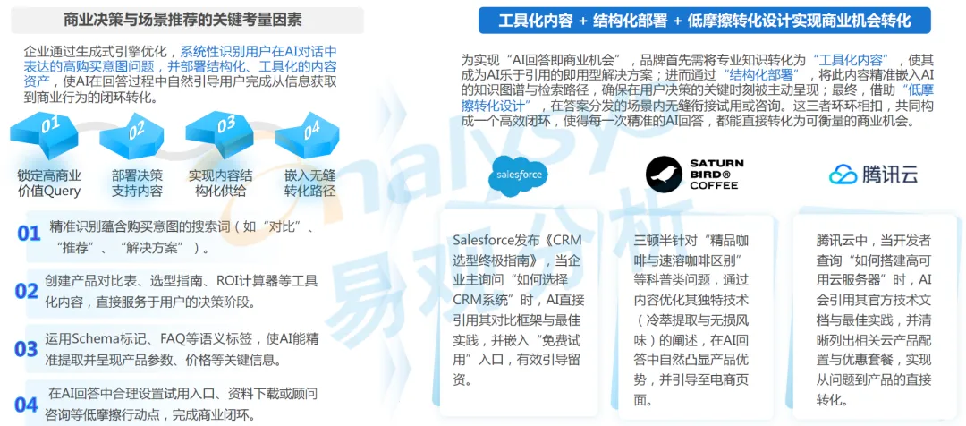 该场景的核心落地逻辑是工具化内容 + 结构化部署 + 低摩擦转化设计,三者环环相扣构成高效转化闭环,具体举措分为四步:第一步是锁定高商业价值 Query,精准识别蕴含购买意图的搜索词,例如对比、推荐、解决方案等相关提问;第二步是部署决策支持内容,创建产品对比表、选型指南、ROI 计算器等工具化内容,直接服务于用户的决策阶段;第三步是实现内容结构化供给,运用 Schema 标记、FAQ 等语义标签,使 AI 能精准提取并呈现产品参数、价格等关键信息;第四步是嵌入无缝转化路径,在 AI 回答中合理设置试用入口、资料下载或顾问咨询等低摩擦行动点,完成商业闭环。目前 Salesforce、三顿半、腾讯云等企业已形成成熟实践,例如 Salesforce 发布《CRM 选型终极指南》,当企业主询问 “如何选择 CRM 系统” 时,AI 直接引用其对比框架与最佳实践,并嵌入免费试用入口,有效引导用户留资,实现了高效转化。