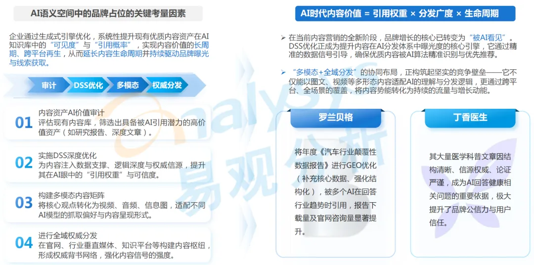 该场景的核心落地逻辑是 “多模态 + 全域分发” 的协同布局,在 AI 时代,内容价值 = 引用权重 × 分发广度 × 生命周期,DSS 优化是提升内容在 AI 分发体系中曝光度的核心引擎。具体落地举措包括:开展内容资产 AI 价值审计,评估现有内容库,筛选出具备被 AI 引用潜力的高价值资产,例如研究报告、深度文章等;实施 DSS 深度优化,为内容注入数据支撑、逻辑深度与权威信源,提升其在 AI 眼中的引用权重与可信度;构建多模态内容矩阵,将核心观点转化为视频、音频、信息图等形态,适配不同 AI 模型的抓取偏好与内容呈现形式;进行全域权威分发,在官网、行业垂直媒体、知识平台等构建内容枢纽,形成权威背书网络,强化内容信号的强度。目前罗兰贝格、丁香医生等机构已形成成熟实践,例如罗兰贝格将年度《汽车行业颠覆性数据报告》进行 GEO 优化,补充核心数据、强化结构化,被多个 AI 在回答行业趋势时引用,显著提升了报告下载量及官网咨询量。