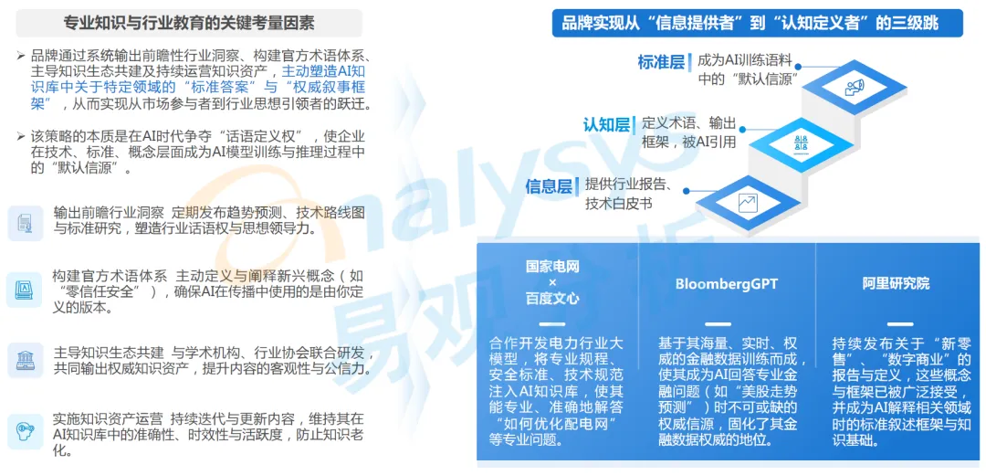该场景的核心目标是让品牌成为 AI 知识库中的 “专业答案”,核心是品牌通过系统输出前瞻性行业洞察、构建官方术语体系、主导知识生态共建及持续运营知识资产,主动塑造 AI 知识库中关于特定领域的标准答案与权威叙事框架,从而实现从市场参与者到行业思想引领者的跃迁。该策略的本质是在 AI 时代争夺话语定义权,使企业在技术、标准、概念层面成为 AI 模型训练与推理过程中的默认信源,实现从信息层到认知层再到标准层的三级跳,最终成为 AI 训练语料中的默认信源。